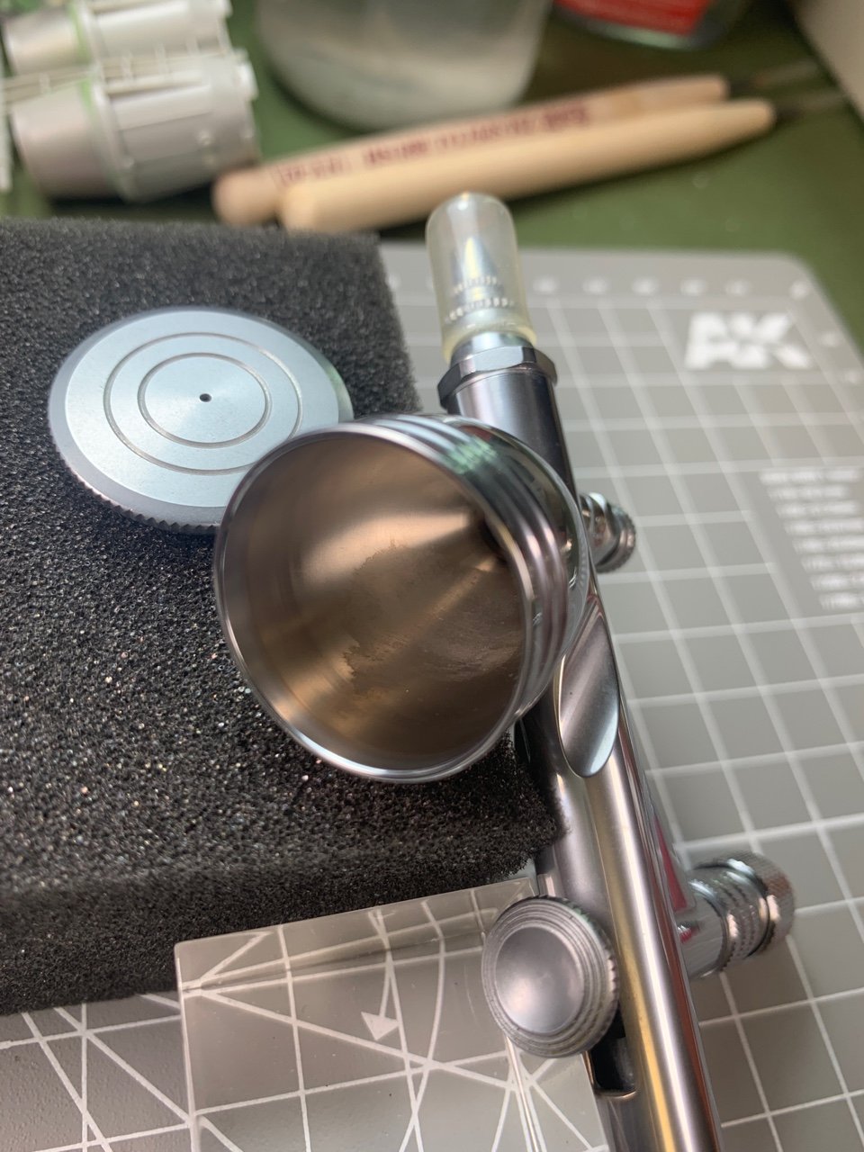 도료컵 안쪽에 원래부터 있던 약간의 얼룩이 있는데 작업하시는데에는 문제 될 것이 없습니다.