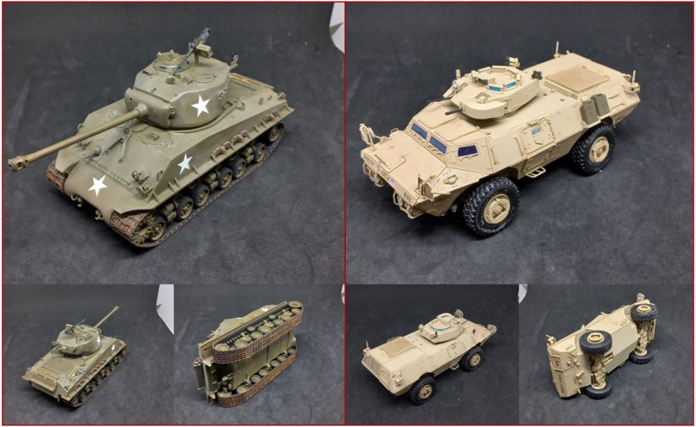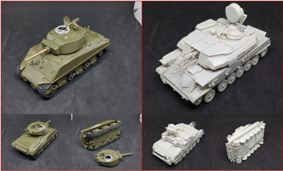4. 아카데미 재포장의 점보와 드래곤 쉴카입니다. 점보는 포신이 무거워 자꾸 쳐져서 고정 시켰구요. 쉴카는 접합부의 변색이 심합니다. 판매가 그대로 구매시 아마 드래곤 본래꺼의 궤도가 있을건데 찾아서 드리구요. 판매가에서 만원 더 추가해주시면 모델카스텐제를 드립니다.