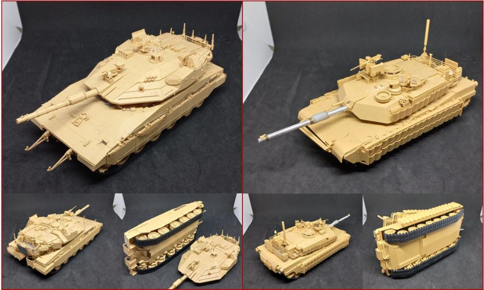3. 두번째 메르카바와 M1은 각각 멩과 아카데비 제품입니다. 메르카바는 가동식 스프링의 서스펜션과 가동식 궤도이고, 체인 커튼이 몇개 떨어져 나갔습니다. 아카데비 M1은 메탈 포신 적용 하였으며 포구 안정기는 원래의 레진제를 읽어버려 사출상의 것을 짤라서 붙여 줬습니다.