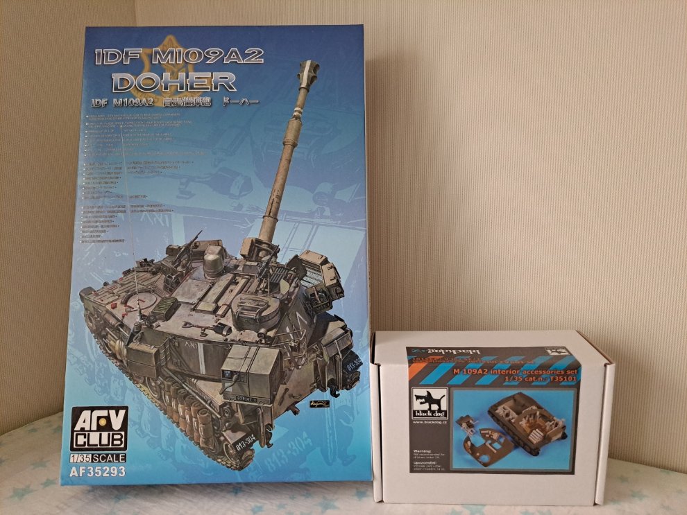 사진에서와 같이 AFV club1/35 IDF M109A2 Doher 미개봉 신품(레진인형 포함 한정판)과