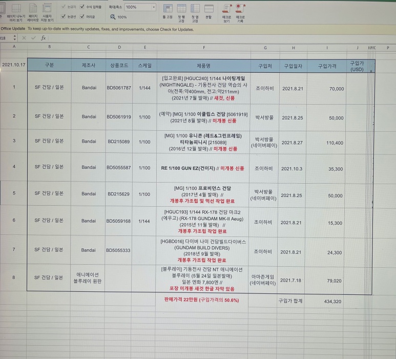 반다이 건담 등 프라모델 일괄 22만원에 판매[구입가격의 50.6%]합니다.