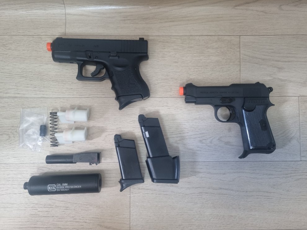 글록은 소음기, 흡업고무, 130스프링, 피스톤, 탄창 등 부속들 포함이며 1934는 총과 본 박스 입니다.