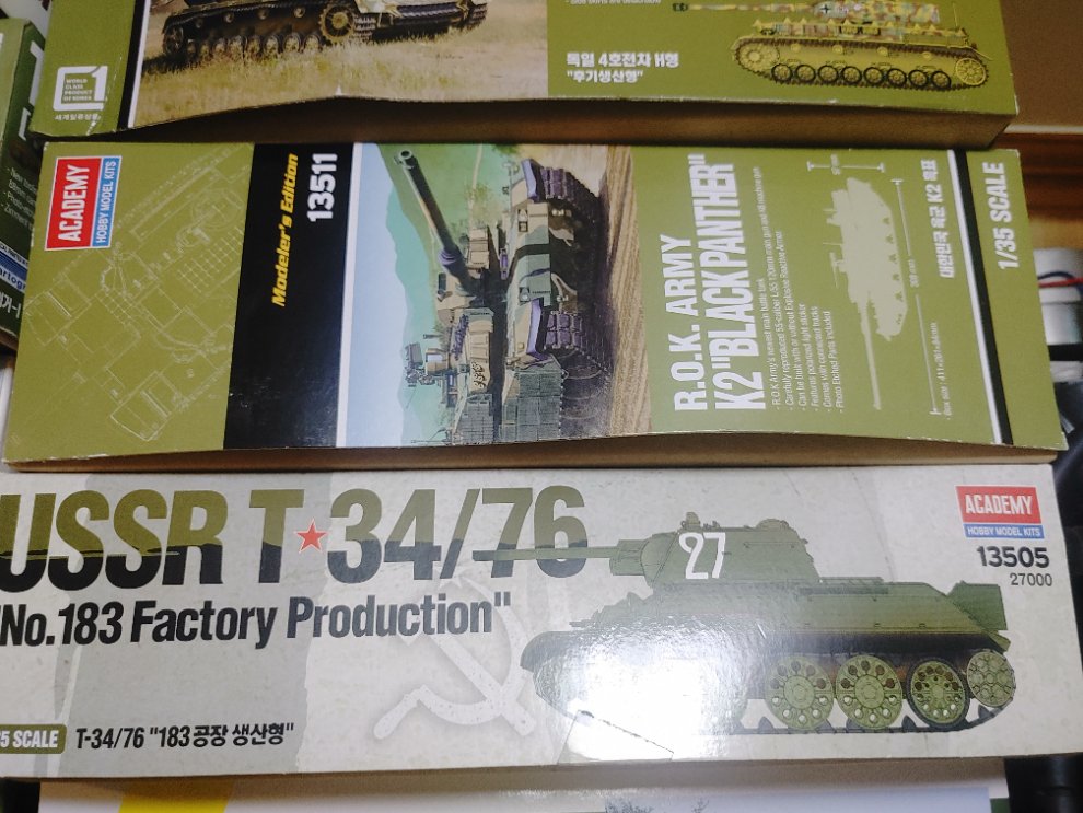 아카데미 K2 모델러 에디션, 아카데미 T34/76 일괄로 3.5만원에 판매합니다. 직거래는 대구쪽이며 택배시 택배비 3000원 입니다. 구매 희망자분은 쪽지 부탁드립니다.