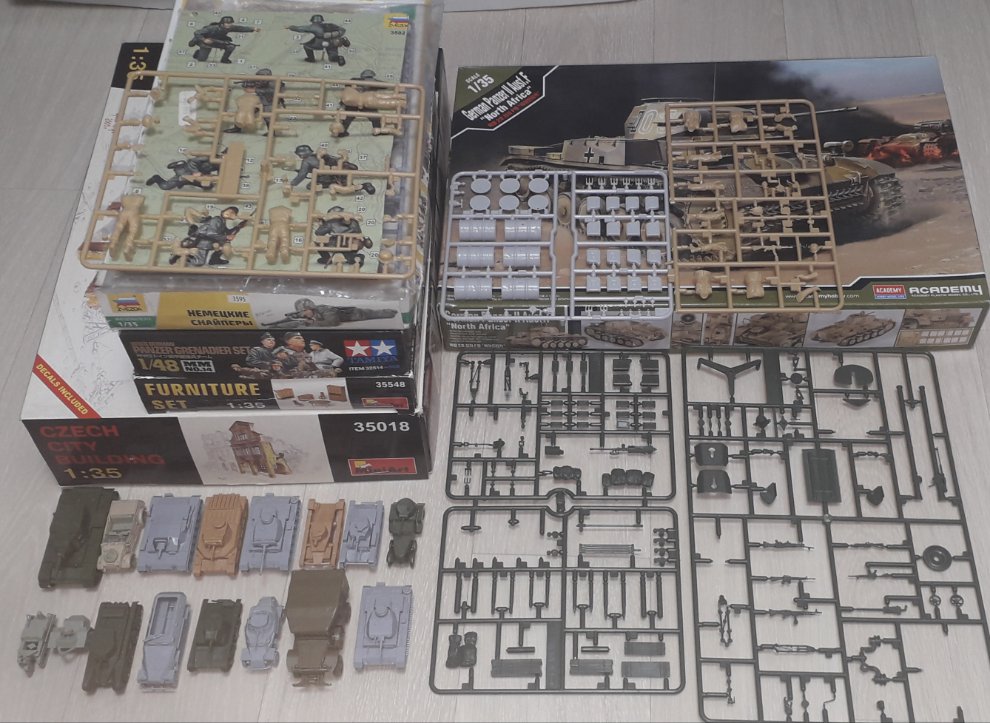 -위로부터 1번 1명사용, 2번 저격병은 타미야전차병(사진)으로 교체, 우측아카2호는 하체일부조립(사진참조), 1/100 즈베즈다 조립킷 12개 포함.