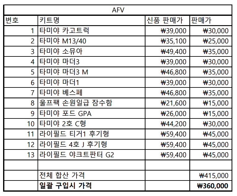 가격 내립니다. AFV 일괄 가격 배송료 포함 34만원