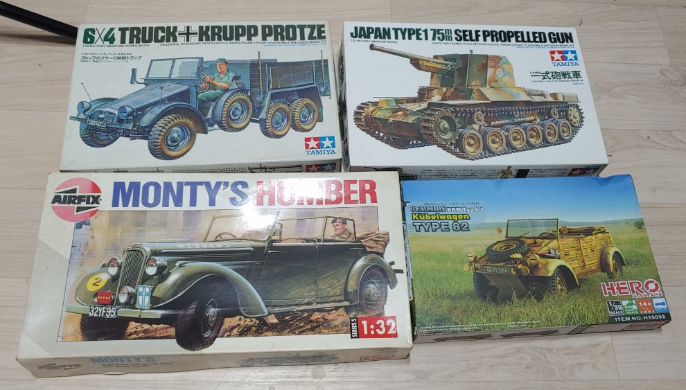 4종 모두 미조립 제품 입니다만 에어픽스 몬티 트럭은 일부부품 런너에서 떨어져 있습니다.