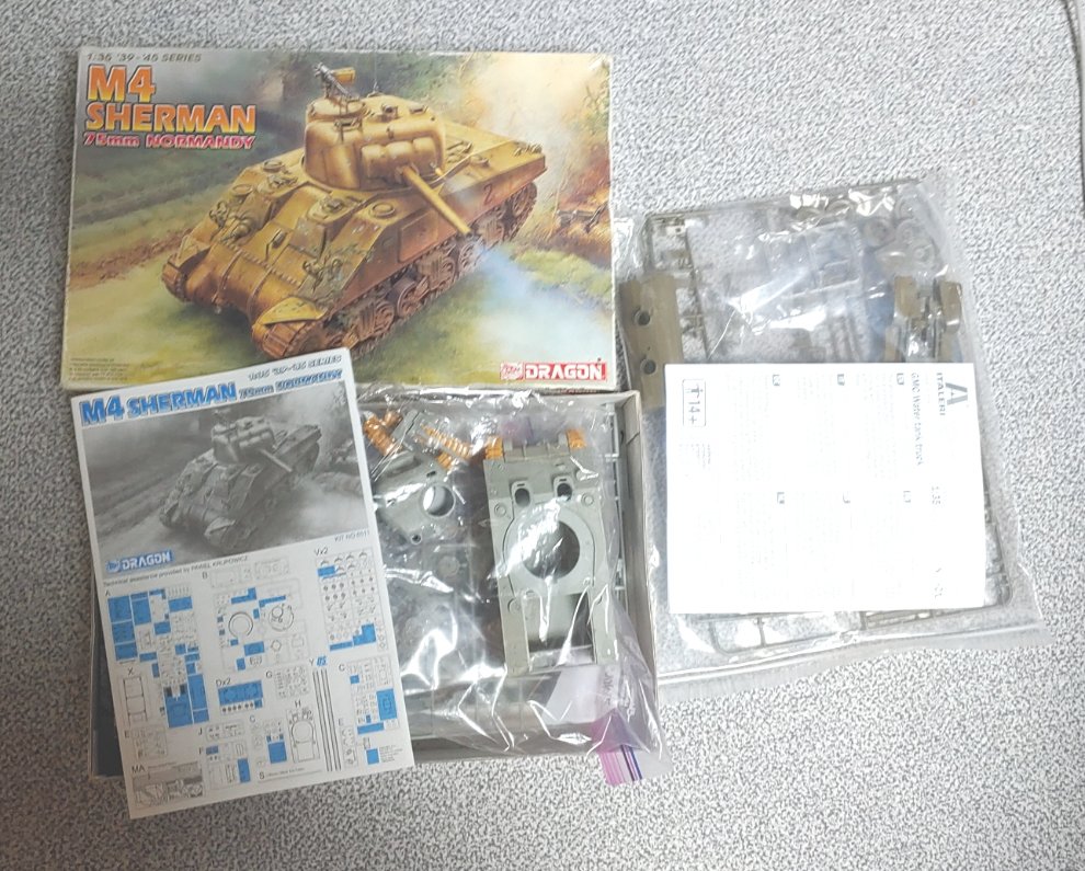M4 셔먼 - 동체 포탑 조립 , 드래곤 트랙이 경화 되어 사용불가, 그외 미사용 에칭 및 데칼 동봉