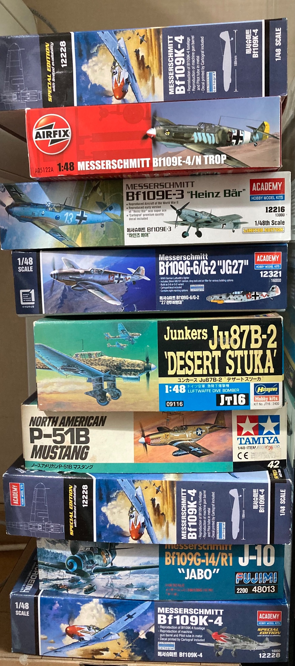 아카데미 1/48 bf109k 한정판 11,000 원 미개봉 새제픔 3개 있어요. 메탈 제품이 포힘되어있고 카토그라프 데칼 포함이에요에어픽스 1/48 bf109e 개봉 부품 두개 런너에서 탈거 조종사 인형만 다른 곳에 썼어요 18,000원