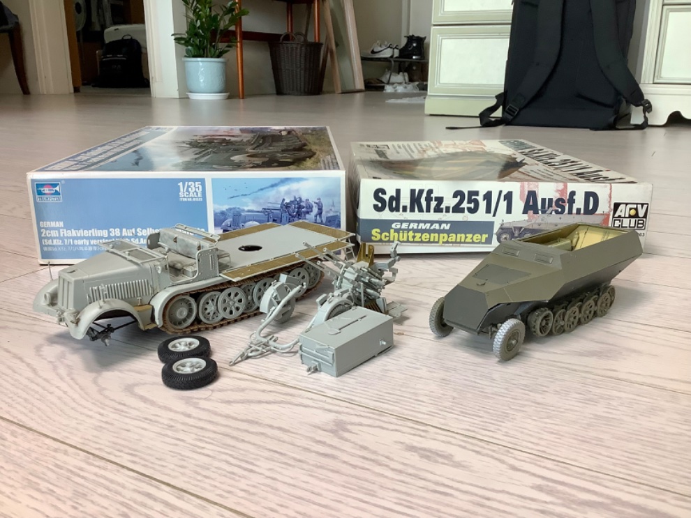 아래 두 개, 송포 5만원에 팝니다. 대공반괘도 차량은 하체 도색&80%정도 조립진행 되었으며, AFV Club것은 50% 정도 조립되었고 내부 다크엘로우로 기본도색 되어 있습니다. 쪽지 주시면 연락 드리겠습니다.