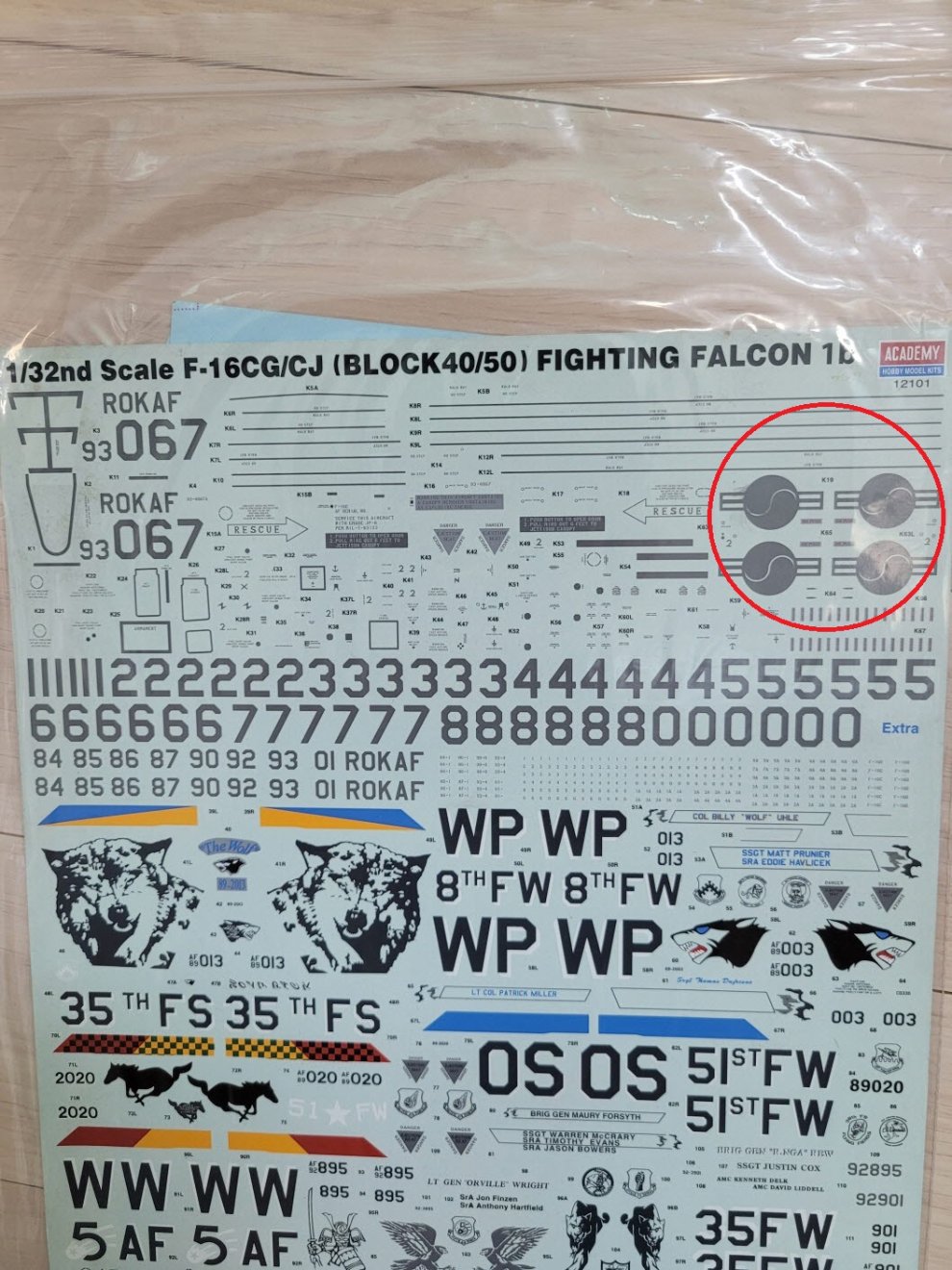 첨부사진과 같이 아카데미 1/32 f-16에 있는 한국군 데칼 구합니다.