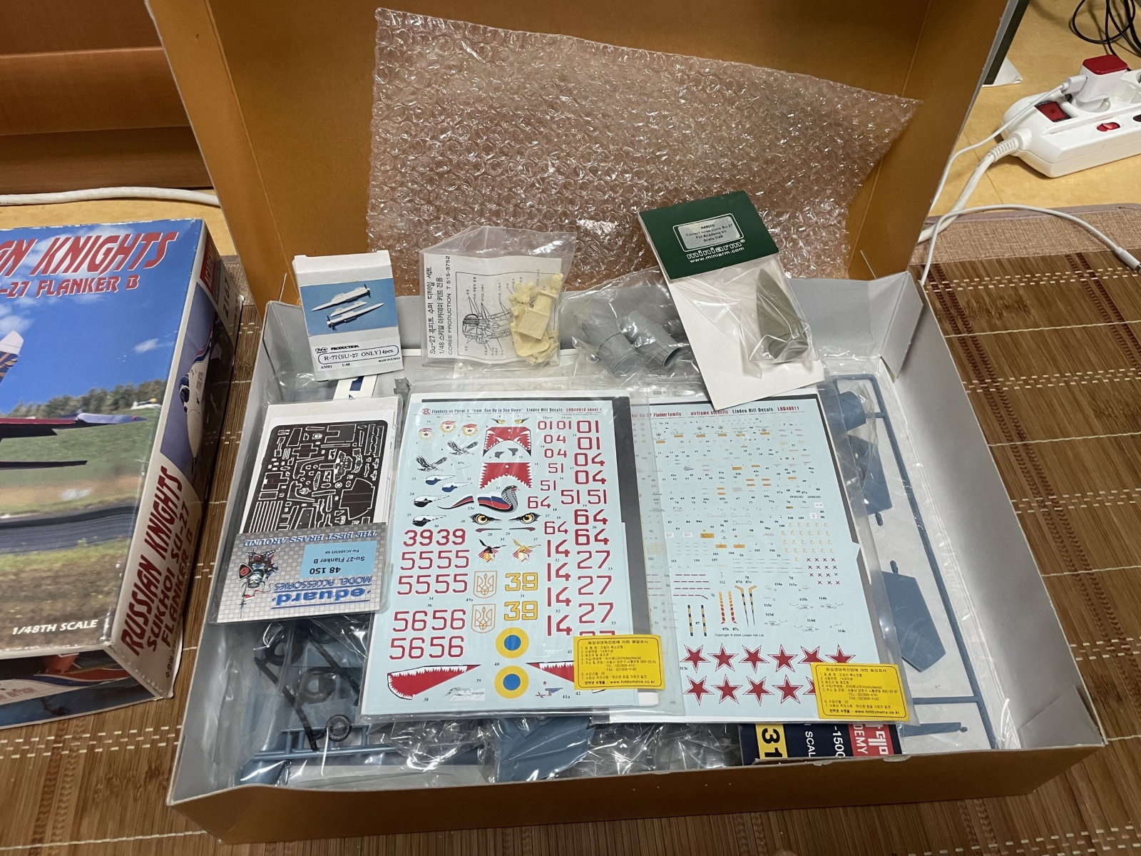 하비캠프제 레진 배기노즐, 에듀어드제 에칭, Coree제 레진 콧핏 세트, Miniarm제 레진 노즈콘, 레진제 R-77 미사일 세트, 런던힐제 'FLANKERS on Patrol Part.3 - From sun up to Sun down 데칼 포함입니다.