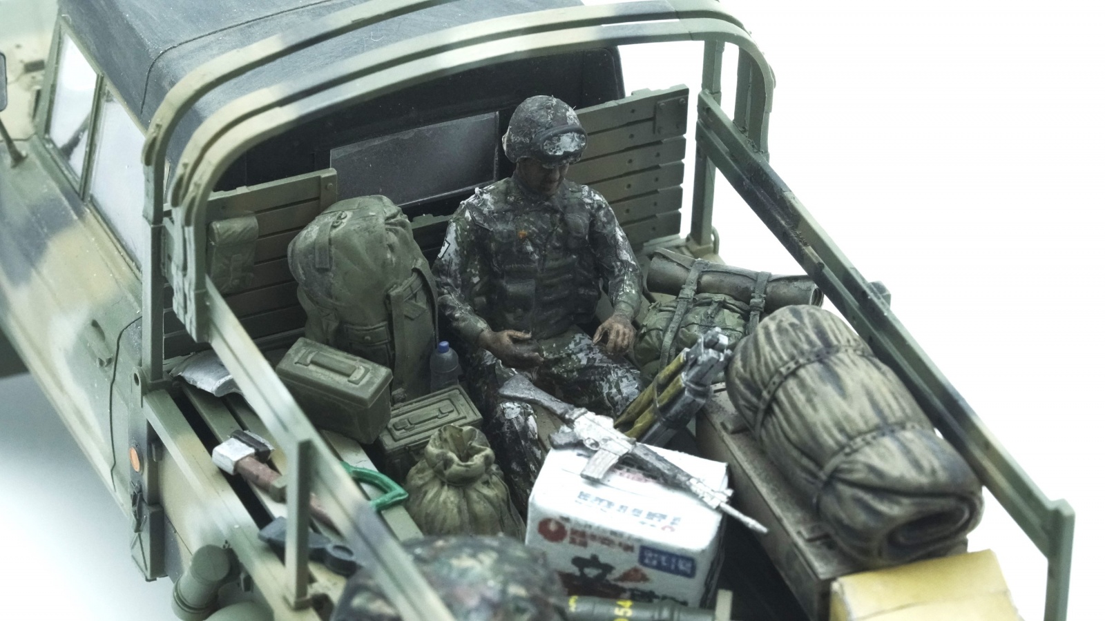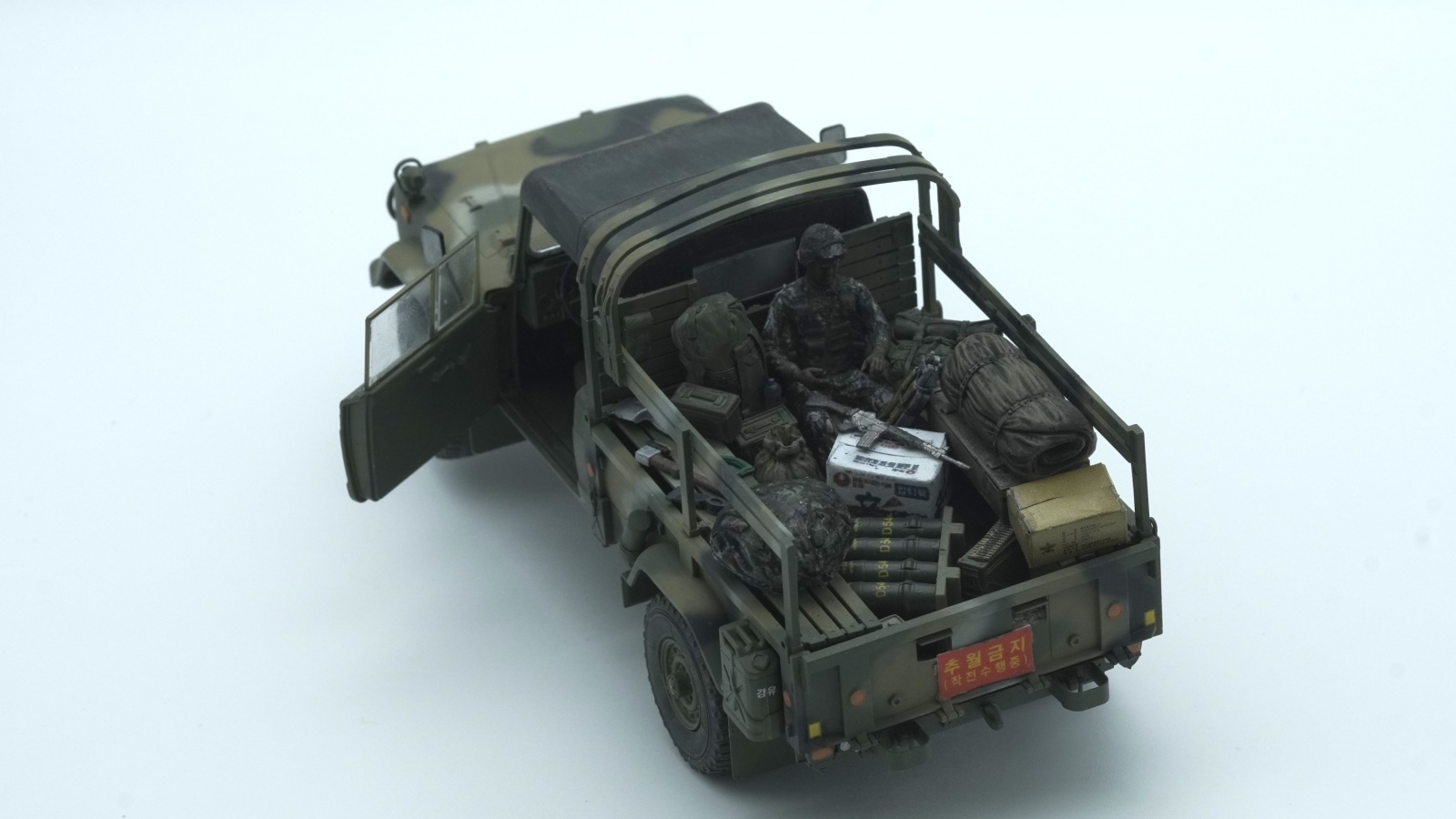 킷외에 사용한 제품은 ,별매 레진장비품,,별매 한국군 위장무늬데칼,별매 메탈 안테나등등을 사용했습니다 운전석 및 조수석 문 열고 닫을수 있습니다.