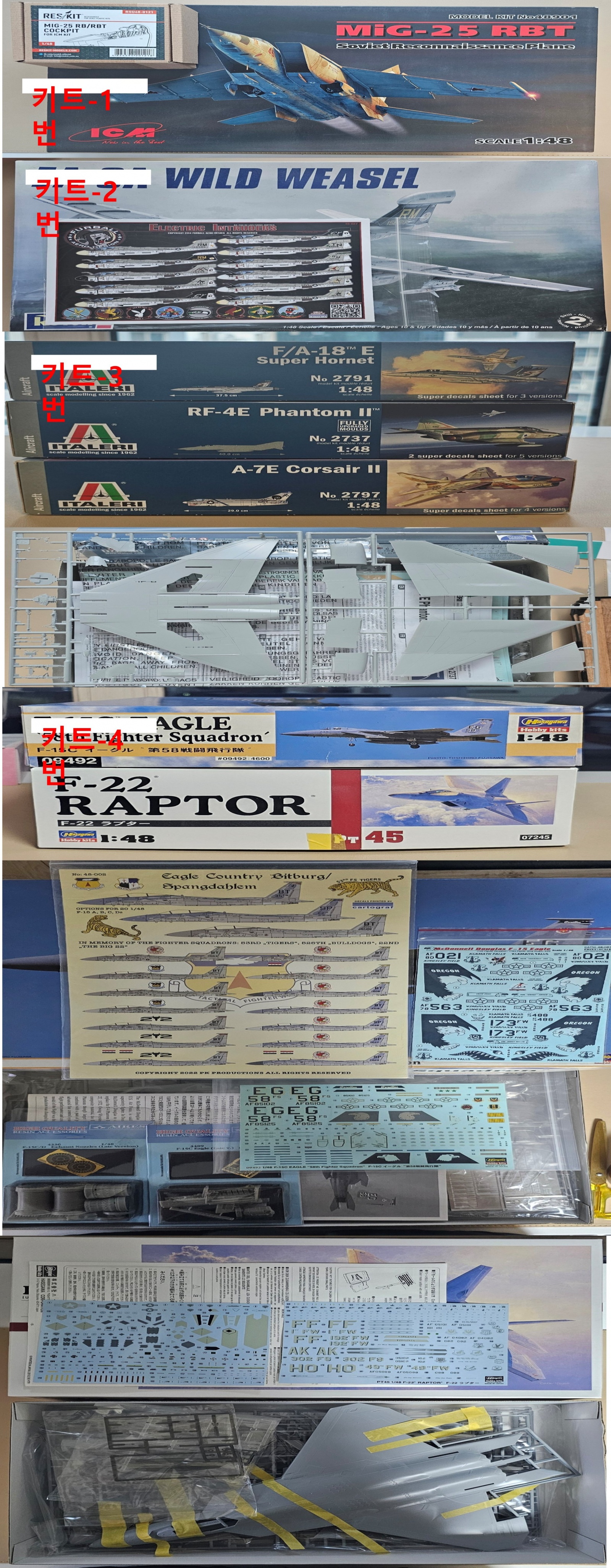 키트-4번 : 1/48 하세가와 F-22(동체 비닐개봉, 데칼 2등분), F-15C(데칼황변) + 별매데칼 2종 + 아이리스 콕핏, 엔진노즐 : 10만원
