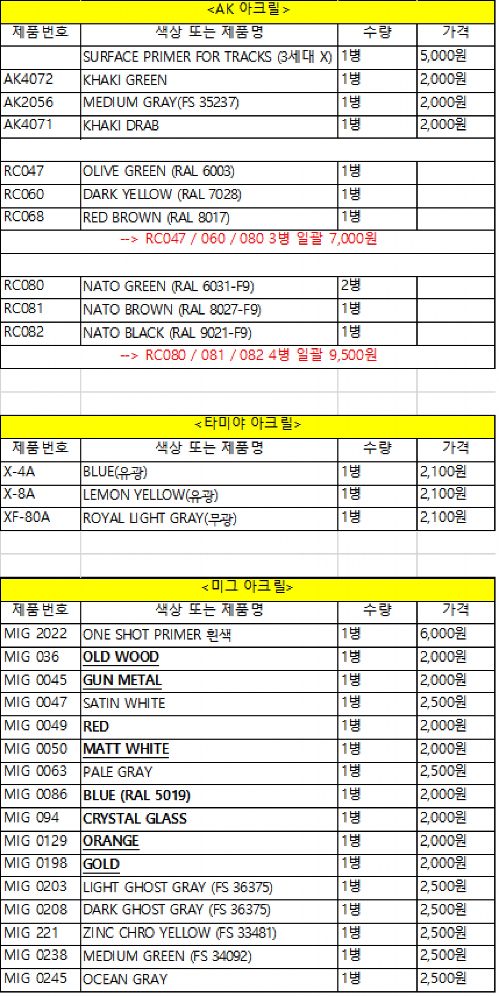 <AK/타미야/미그 아크릴 도료>
