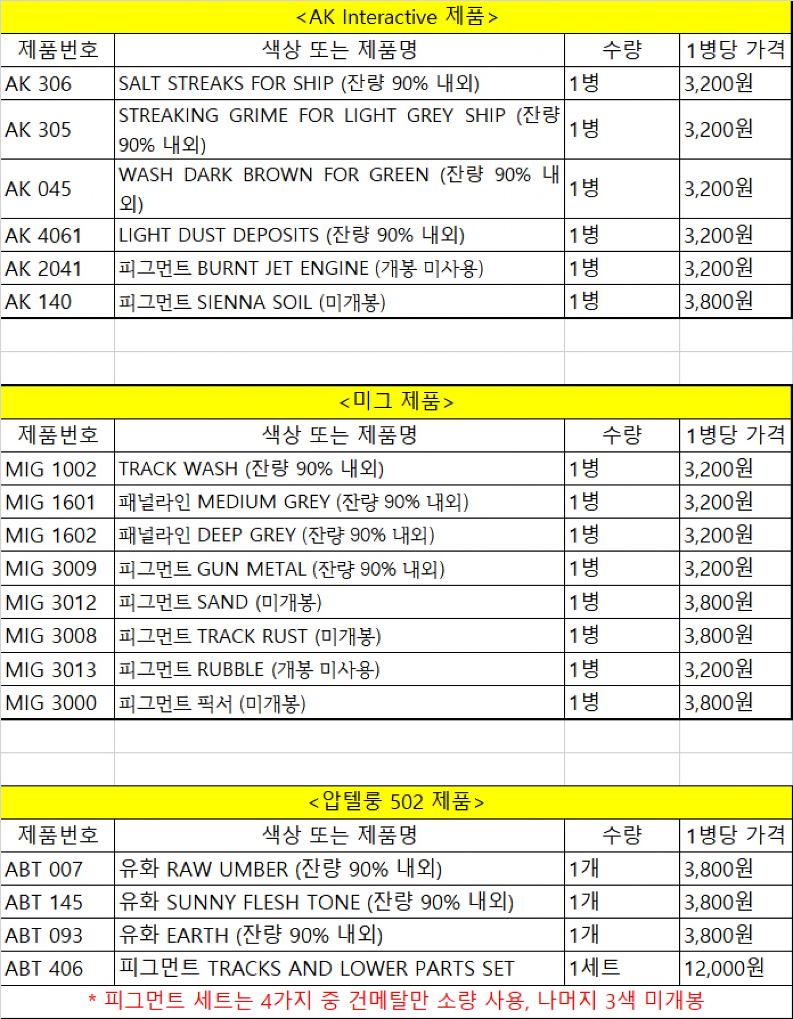 최대한 1번도 사용하지 않은 신품만 판매하고자 최대한 추렸지만, 잔량 95% 이상인 도료가 몇 병 혼입되었을 수 있습니다. 큰 차이가 나지 않아서 육안상 구분이 살짝 어렵기 때문에 이 점은 양해 부탁드리겠습니다.