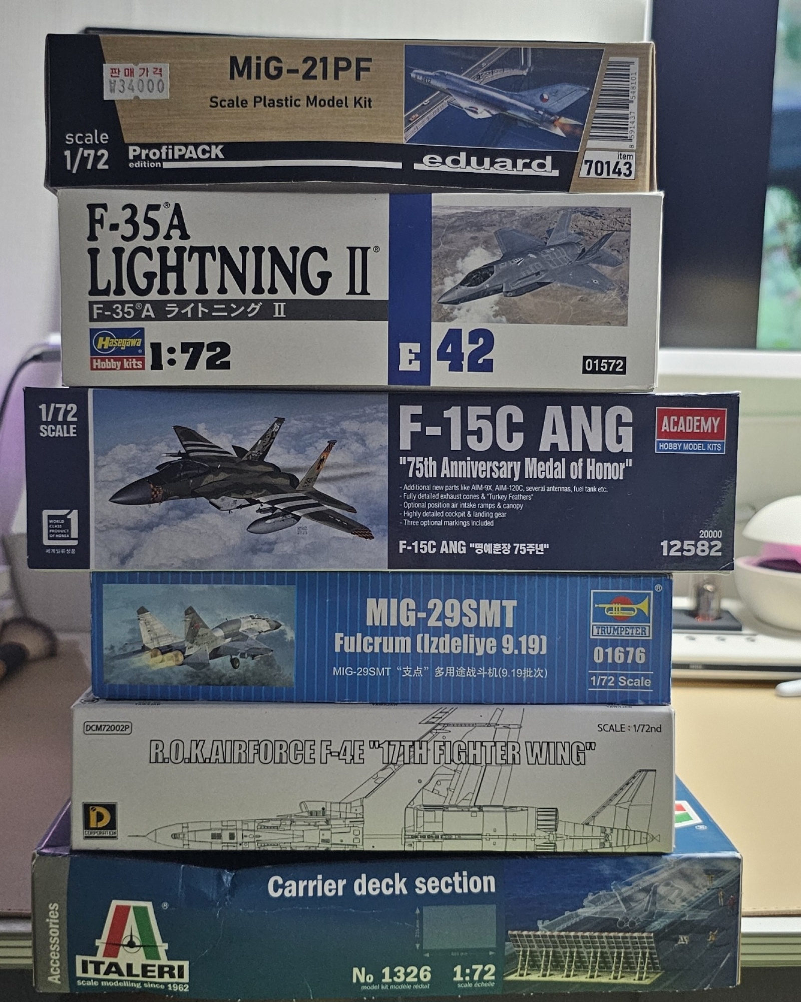 에듀워드 MIG-21 프로피팩, 하세가와 F-35A(데칼 2등분), 아카데미 F-15C, 트럼페터 Mig-29,