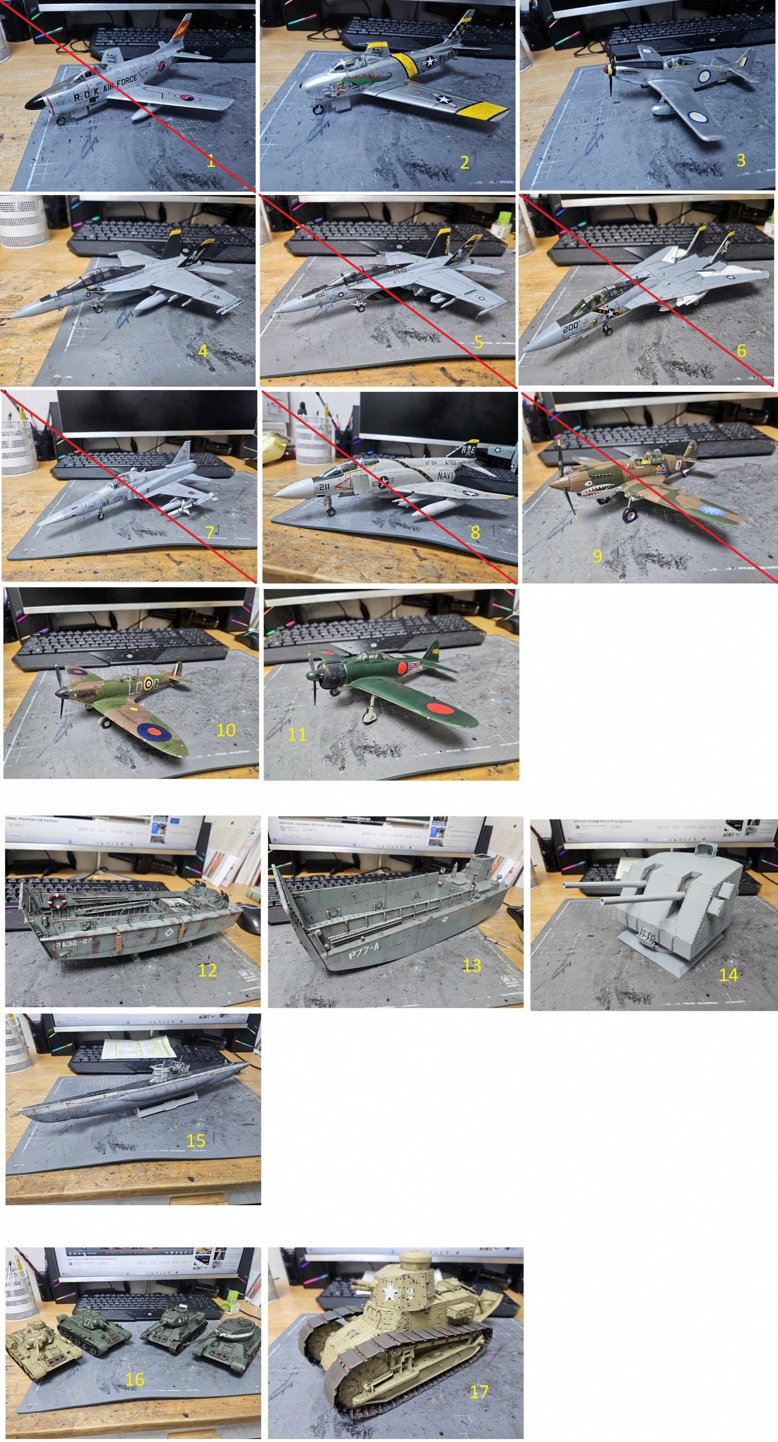 9. 에어픽스 1/48 P-40, 10. 에어픽스 1/48 스핏파이어, 11. 하세가와 1/48 제로)