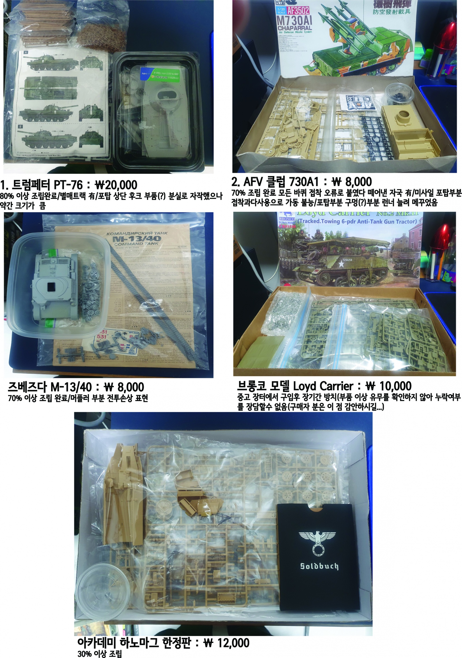 상기 조립 중단한 아이템 판매합니다. 제조사 상품명 가격 하단에 특이 사항 기록했사오니