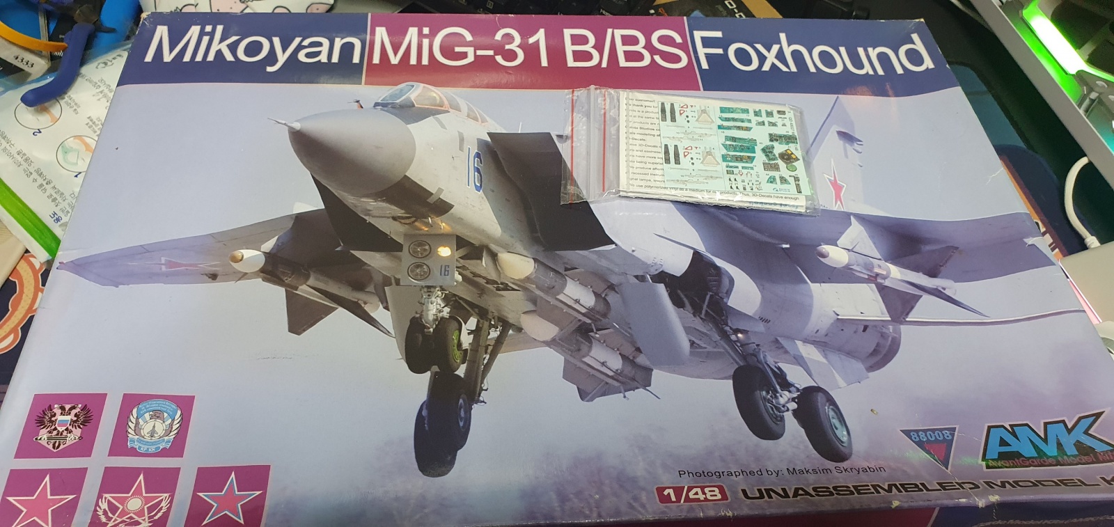 AMK 1/48 mig-31 + 3d 데칼 7만원 (사출좌석이 조립이 되어있습니다/박스 색이 바래져있습니다)