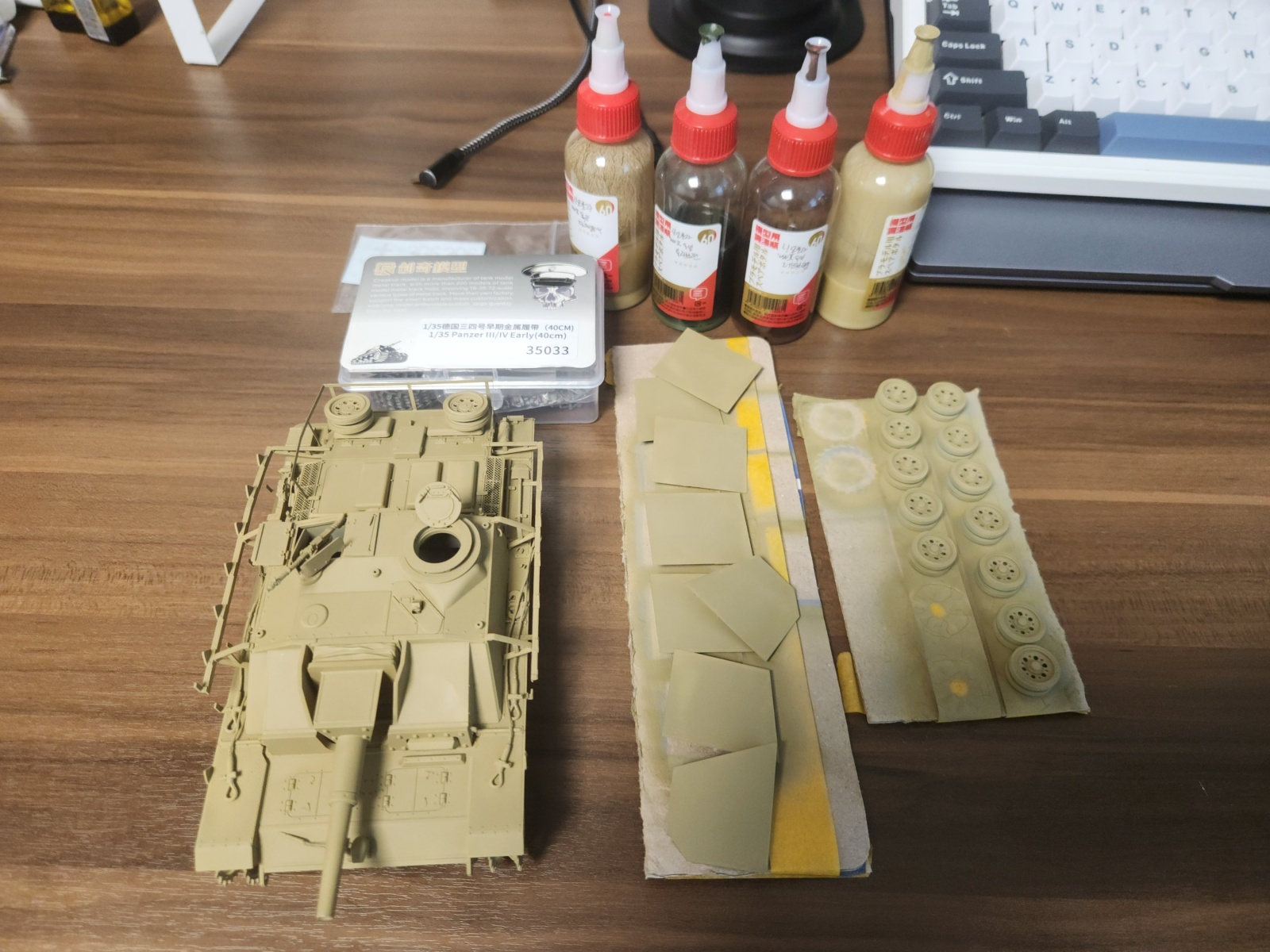 구성품: 차체+쉬르첸+보기륜+데칼+3/4호 초기형 메탈궤도(조립해놓음)+1:2비율 희석 ak리얼칼라 독일3색, 타미야 다크옐로우