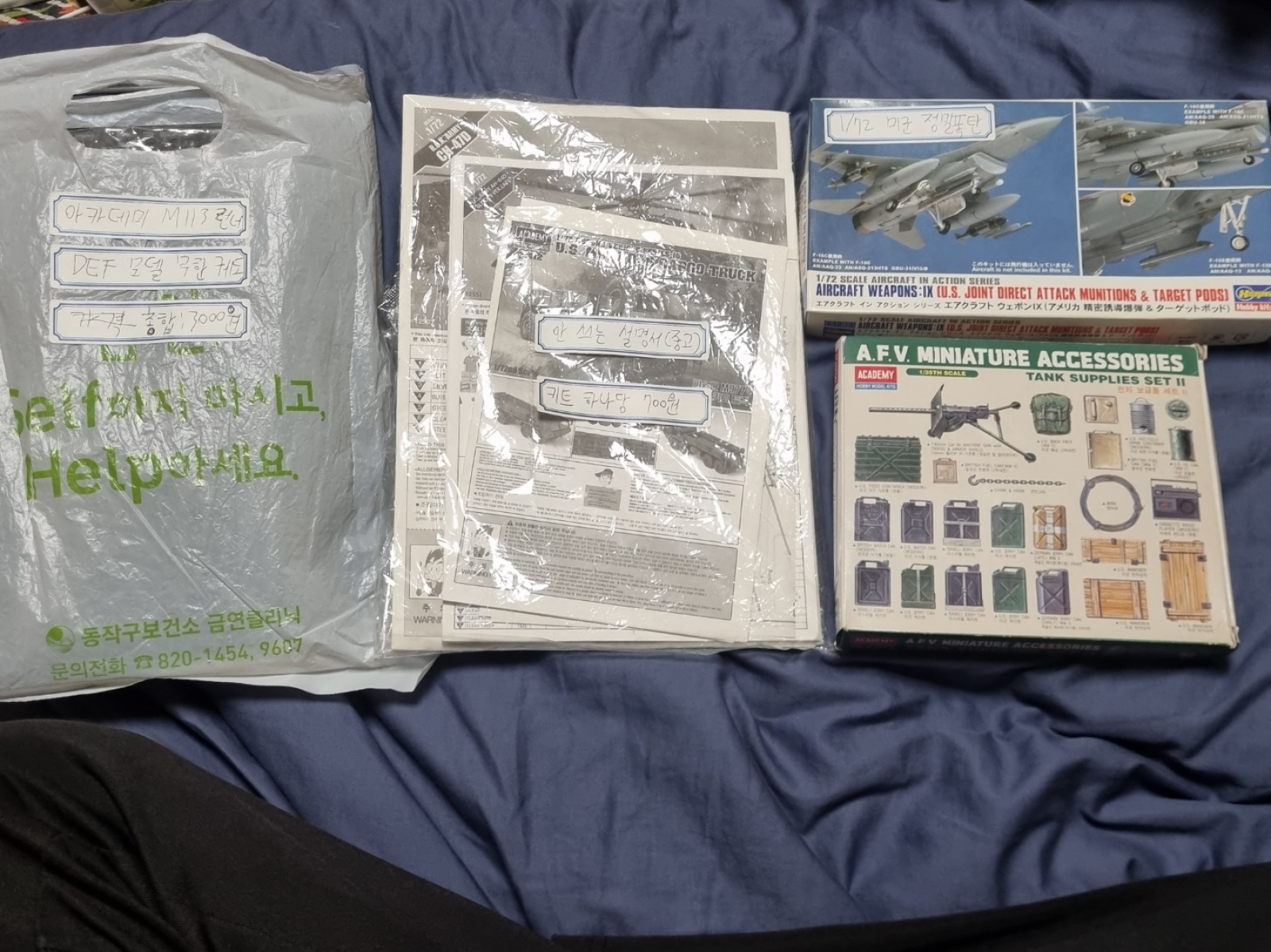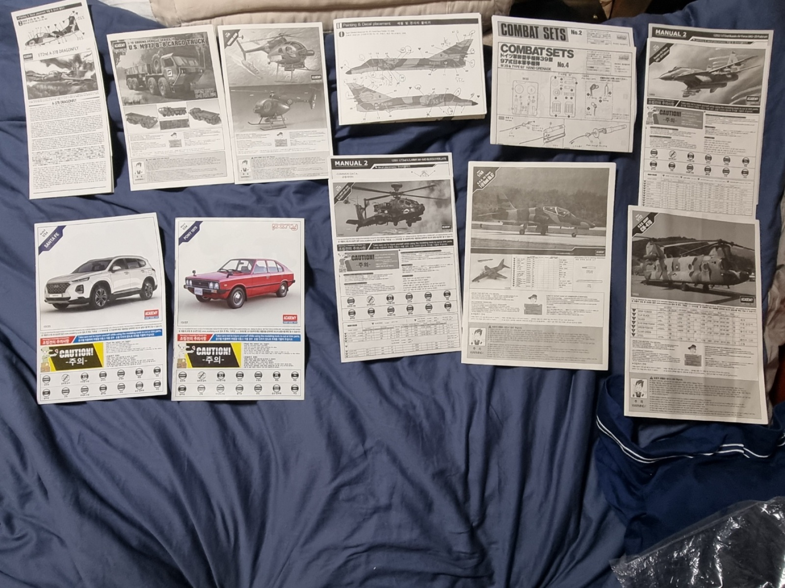 총 11가지가 있고요. 키트 하나분당 600원을 받겠습니다. 구성은 1/72 HEMTT 트럭, A-37 공격기, 쉬페르 에탕다르, CH-47D, AH-64D 후기형, MiG-29 전투기, 1/48 T-59 훈련기, 500MD 대만군형, 1/24 포니1, 싼타페, 1:1 수류탄 설명서로 이루어져 있습니다.