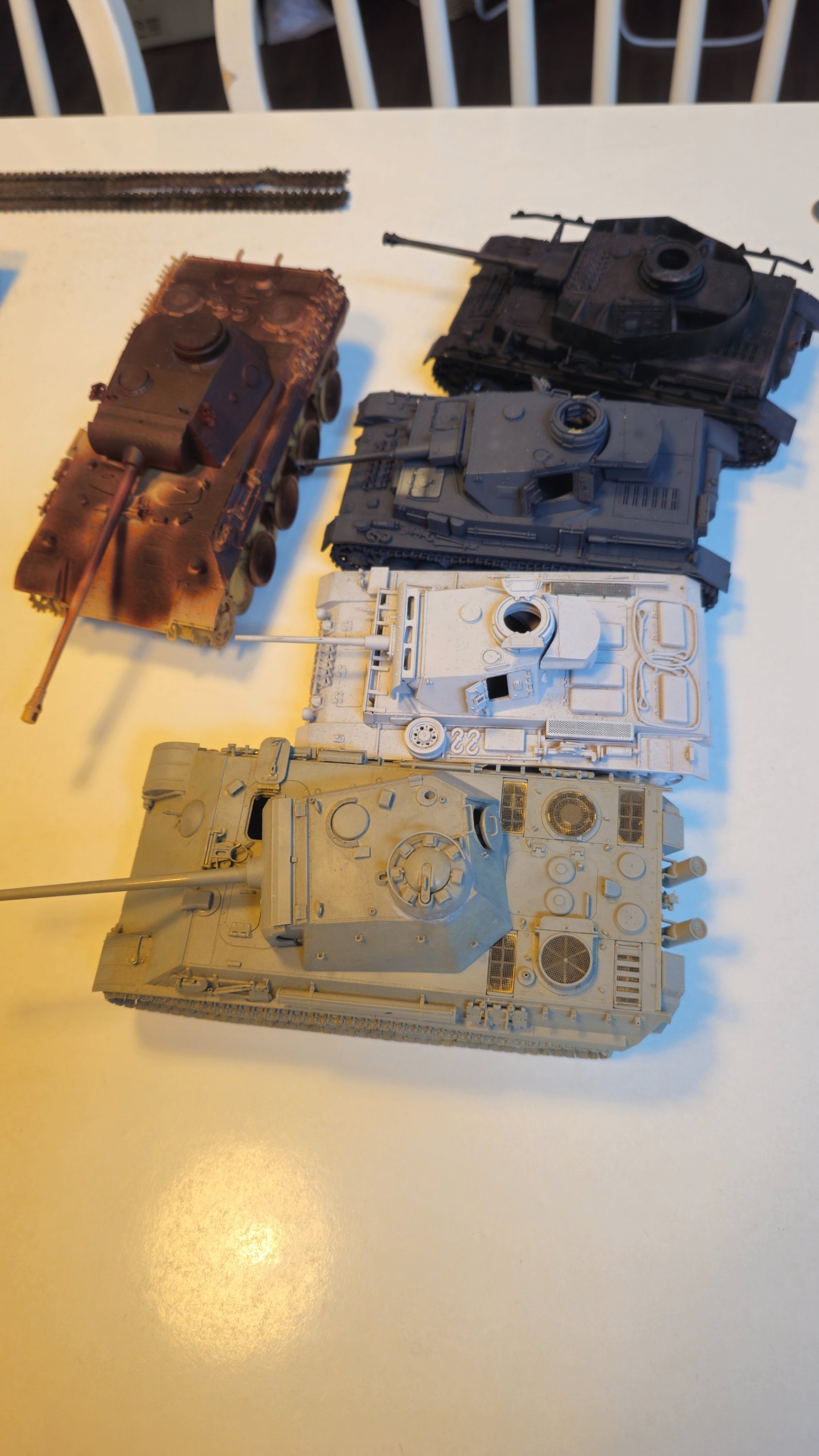 프라모델하는데 시간이 없어서 방치했던 제품들이라 다소 자잘한 부품이 없어진 부분이 있으니 감안 부탁드립니다 타미야 판터D는 사진에 없지만 연질 캐터필러 있습니다 3호전차는 캐터필러가 없습니다