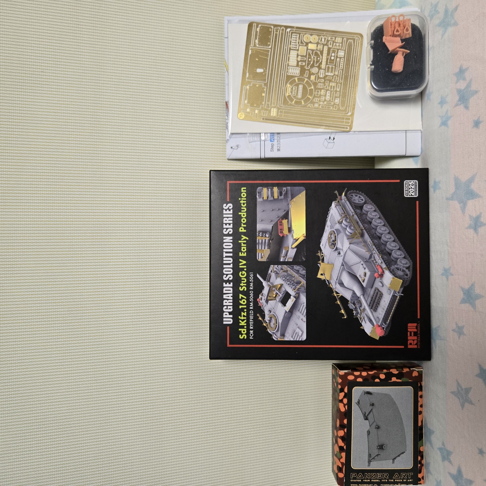 사진에서 보이는 바와 같이 RFM 1/35 Upgrade Solution for Sd.Kfz.167 StuG IV Early Production, 1/35 Upgrade Solution for StuG III Ausf.G RM5069 & RM5073(박스없음), Panzer art 1/35 Tiger 1 early Kursk stowage box를 모두 세트로 분양합니다.
