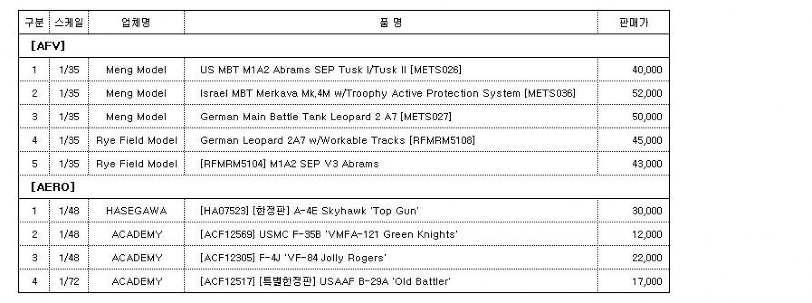 안녕하세요, AFV 및 AERO 판매합니다.