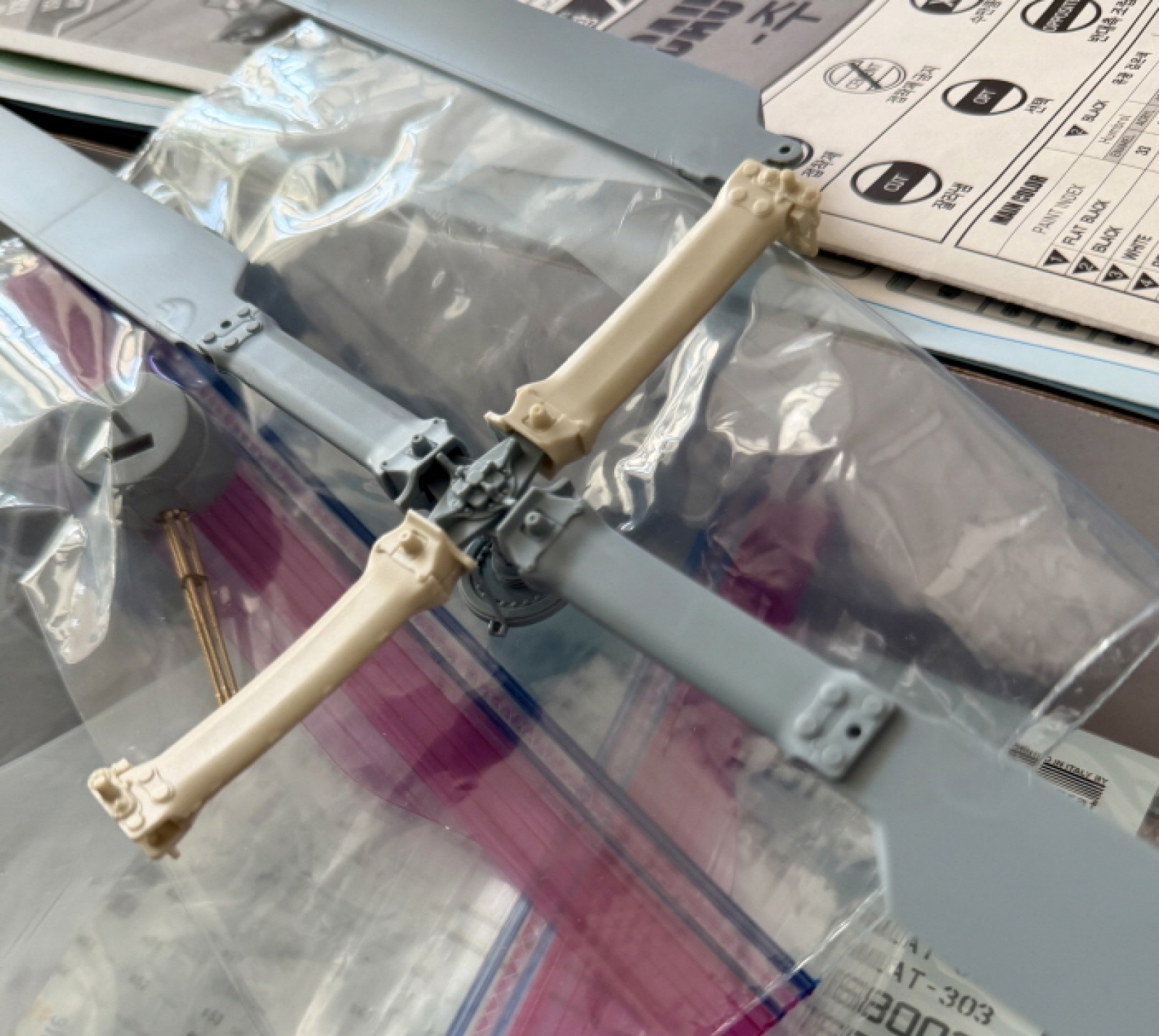 일부 부품 기본 도색되어 있고, 건바렐 조립되어 있으며, 주프로펠러 레진 부품이 약간 휘어져 있습니다.