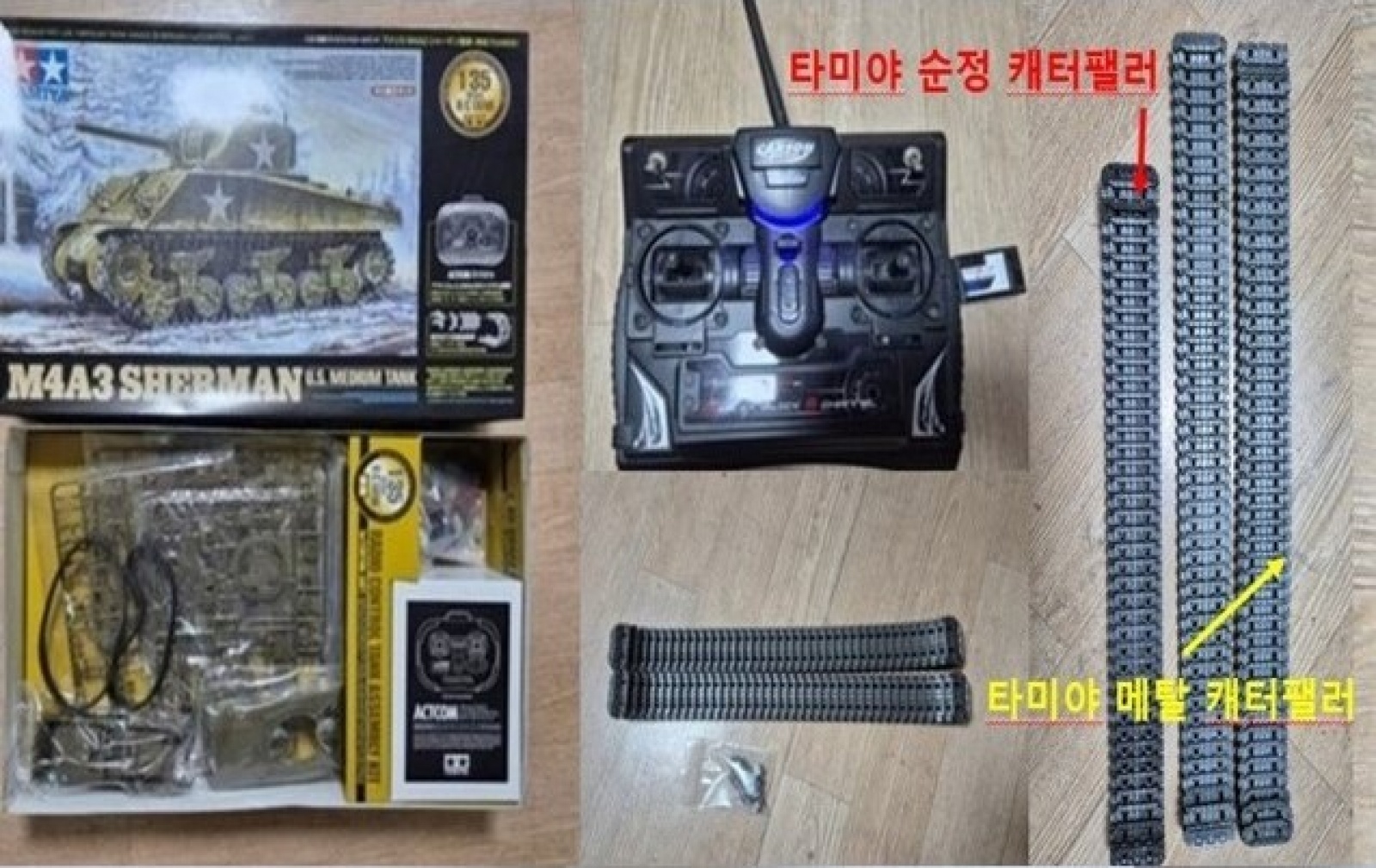 2. 타미야 1/35 4ch 2.4GHZ M4A3 셔먼전차 : 시중가 및 구입가 32만원, 판매가 25만원(택배비 5천원 선불 혹은 착불) 이 키트는 기존 4CH 셔먼에 2.4GHZ 조종기에 플라스틱 연결식 캐터팰러가 동봉된 버전이었습니다. 연결식 캐터팰러는 한번 조립해보니 내구도가 약해 기존 고무 트랙 넣어드립니다. 진짜 RC 구동용 캐터팰러는 메탈 프리울 별매 사시는 편이 낫고, 그게 아니라면 제 상품의 동봉된 타미야 순정 고무트랙 쓰셔도 경사길 안 미끄러지고 잘 올라가고 재밌습니다. 암튼 연결캐터팰러 빠진 가격+할인가에 내놓습니다. 그외 파손 및 분실파츠는 없습니다. 사실분은 연락주세요.