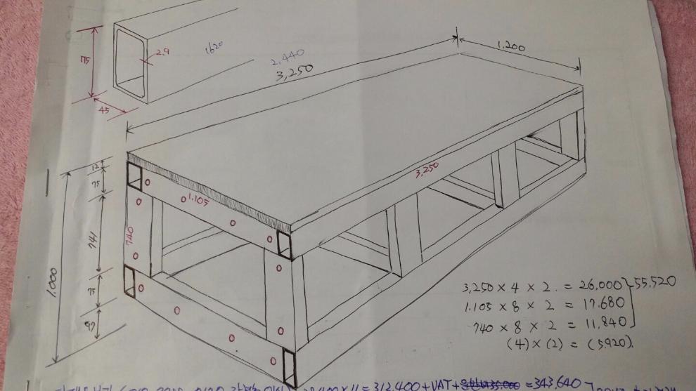 작업내용: 아래 도면의 테이블 두개 제작, 각각 바퀴 4개와 조절좌 4개 부착