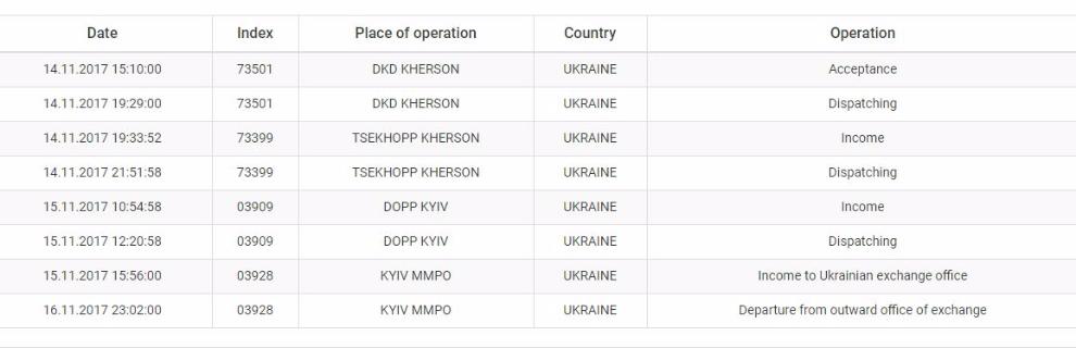 우크라이나 우체국 사이트에서 조회한 결과입니다.