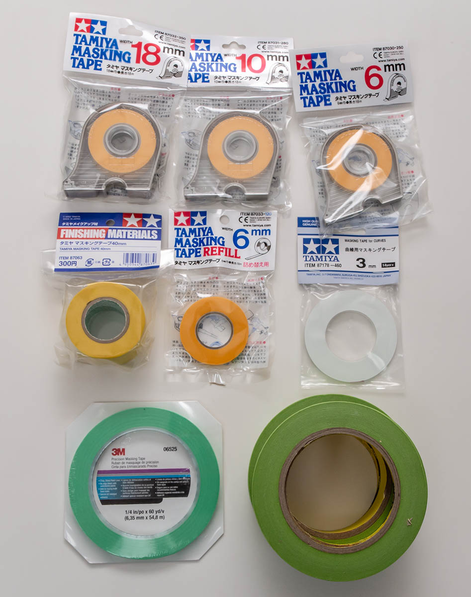 마지막 왼쪽 아래 민트색은 3M 마스킹 테이프 중 가장 값비싼 Automotive Precision Masking Tape 입니다. 마찬가지로 자동차 도색에 특화된 제품입니다만, 3M 마스킹테이프 중 가장 얇고 정밀한 테이프라고 해서 샀습니다. 이것도 해외 모형 커뮤니티에서 추천해준 건데, 10년 전에는 218 이라는 제품이었지만 지금은 단종되어서 어쩔 수 없이 06525 라는 현행 제품을 구입했습니다.