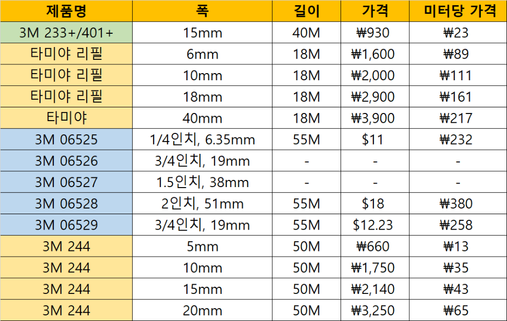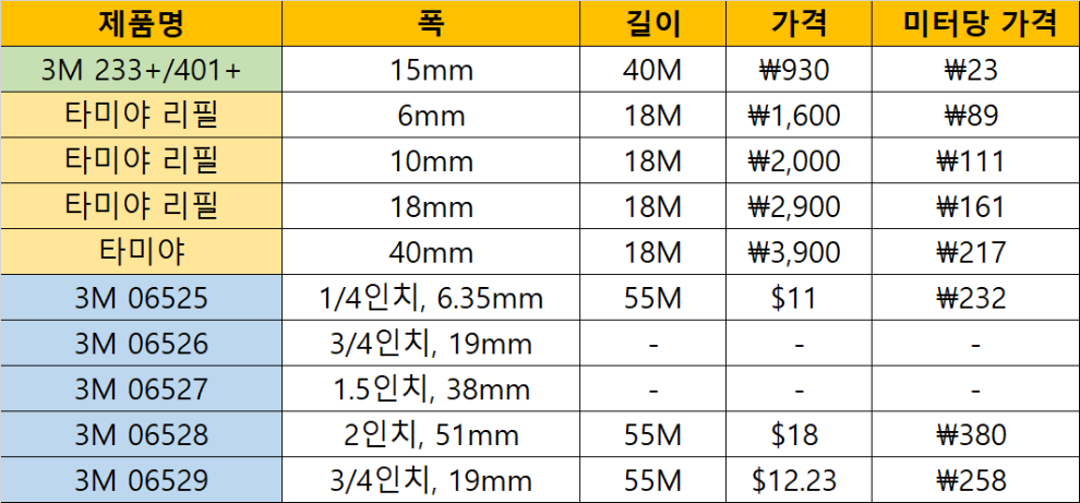 3M 244의 가격은 3M 233+/401+ 의 2배 정도 됩니다만 그래도 타미야의 1/3 정도 밖에 안됩니다. 그러면서 타미야의 완벽한 대체가 가능합니다! 사이즈도 3mm 같이 더 세밀하게 다양하게 있어서 용도에 맞게 구입하실 수 있습니다. 결론을 내리자면 3M 244 하나만 구입해서 써도 충분해 보입니다.