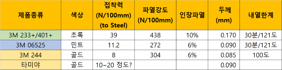 먼저 3M 사이트의 공식 데이터 시트 비교입니다. 미국서 직구한 06525 보다 접착력은 조금 더 떨어지고 두께는 얇은 걸로 나와있는데요. 그와 비슷한 타미야와 같은 성질을 가지고 있을 거라 생각했는데, 실물을 받아보니 실제로 촉감이나 색상 전부 타미야와 거의 동일했습니다.