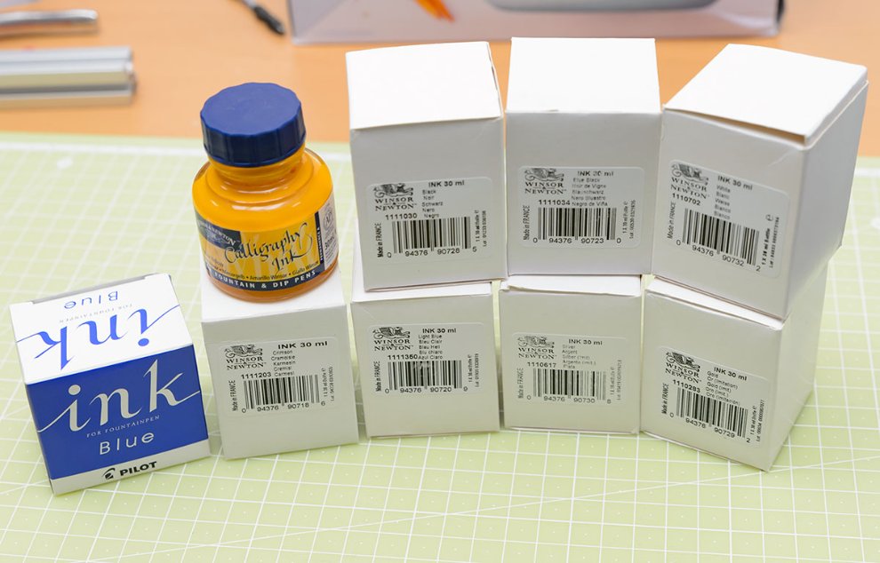 만년필용 잉크는 용매를 이용해 색상을 내는 색소를 액체로 녹인 염료라서 관이 비좁은 만년필이 막히지 않고 쓸 수 있습니다. 또한 내수성이 있어서 한번 마른 후에는 물에 다시 잘 녹지 않게 됩니다. 그러나 내구성은 떨어지므로 햇빛에 반년 이상 노출한다면 색이 두드러지게 탈색하게 됩니다. Winsor & Newton 에서는 Drawing ink 이름으로 26가지 색상을 판매하고 있습니다.
