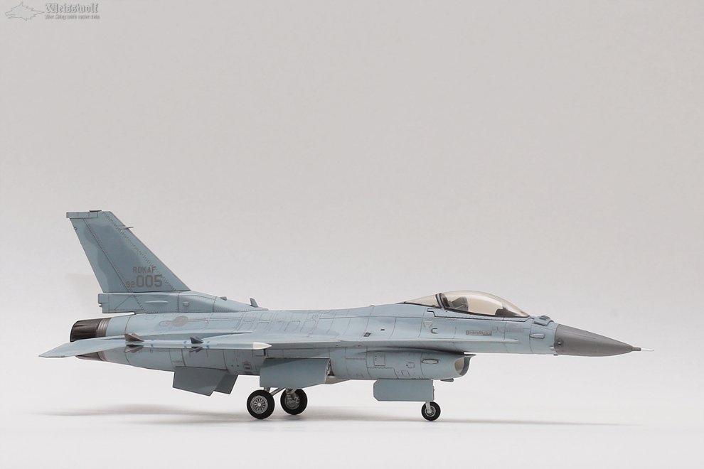 아카데미 1/72 KF-16C. 타미야의 F-16CJ가 나오면서 이제는 가성비 말고는 별 장점이 없는 키트입니다만, 그래도 전 메이커 통털어 (아마도...) 유일하게 정확한 블록 50/52 패널라인을 재현한 점과 KF-16용 ASPJ 부품이 들어 있는 건 분명한 장점입니다. 어설픈 기수 라인과 조립성이 참 아쉽네요.