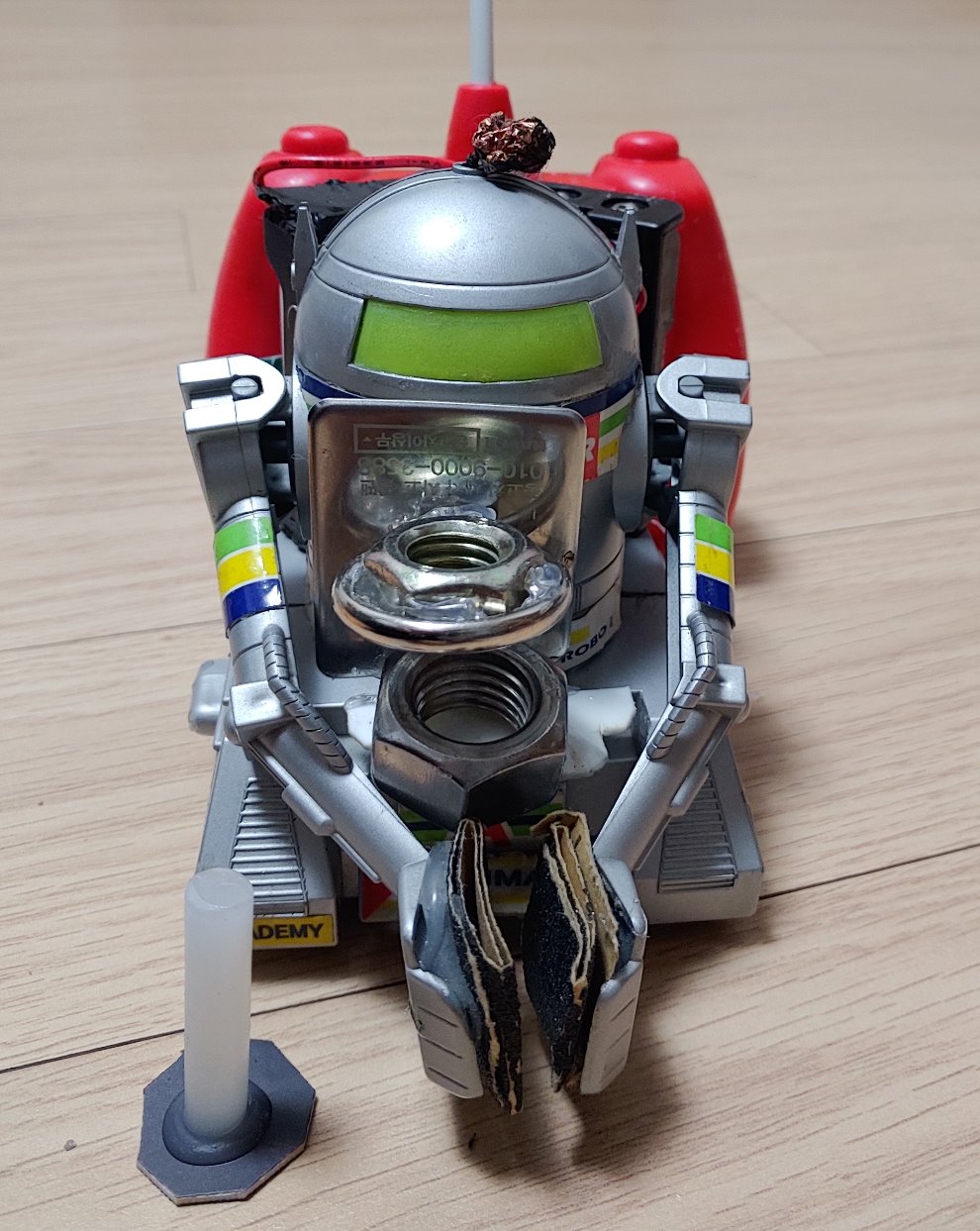 타이어의 방향을 쏠리는 반대편으로 조금이동시켜 진행방향이 쏠리는 반대로 움직이게 조절 그리고 진행방향이 쏠리는쪽엔 무게추[너트]를 이동시켜 마찰력으로 힘에 부쳐 느리게 움직이게하여 비례제어 하였습니다. 깨끗하게 해야 되는데 원리를 파악하기 위해 이것저것 붙이네여