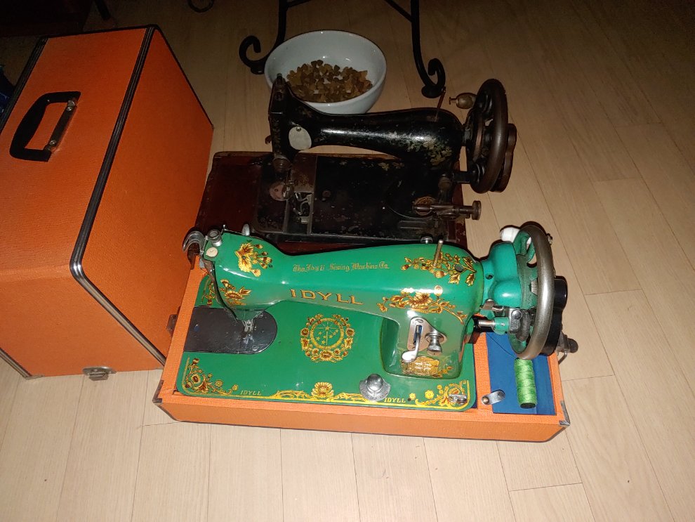 아래 녹색은 집에있는것으로 작동 되는것 인데 위에것은 돌아가긴 하는것같은데 다른 부품이 없나?재봉틀에 대해 모르겠군요?위에것은 100년정도 된것 같고 아래것은 50년 정도 된것 같군요!