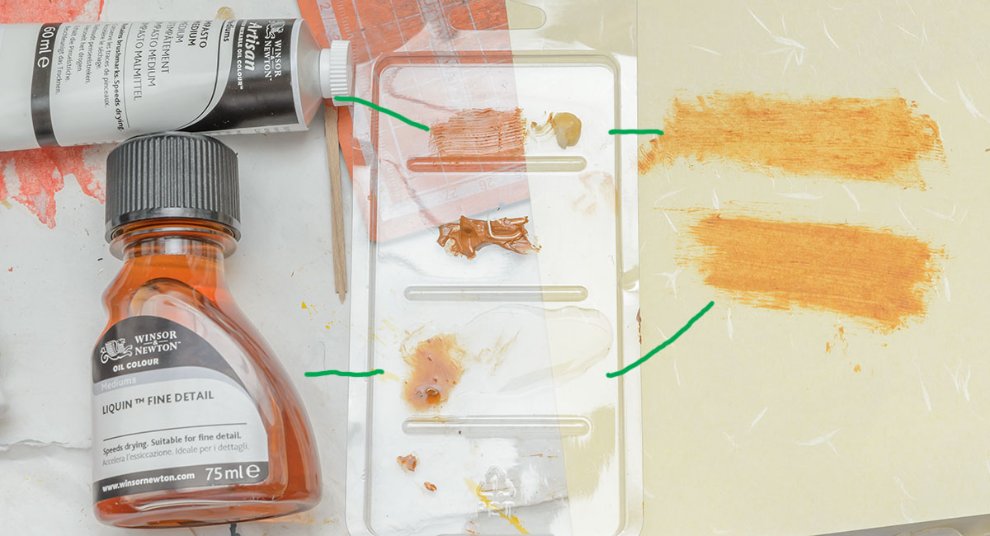 테스트 돌리니 역시 파인디테일은 주루룩 흐르고 유화물감을 섞으면 묽고 투명하게 됩니다. 제품 설명에선 유화물감 2 : 리퀸 1 이상은 쓰지 말고 그보다 적게 섞으라고 합니다. 반면 리퀸 임파스토는 유화 물감과 거의 비슷한 딱딱한 젤이라서 섞기 어렵습니다.