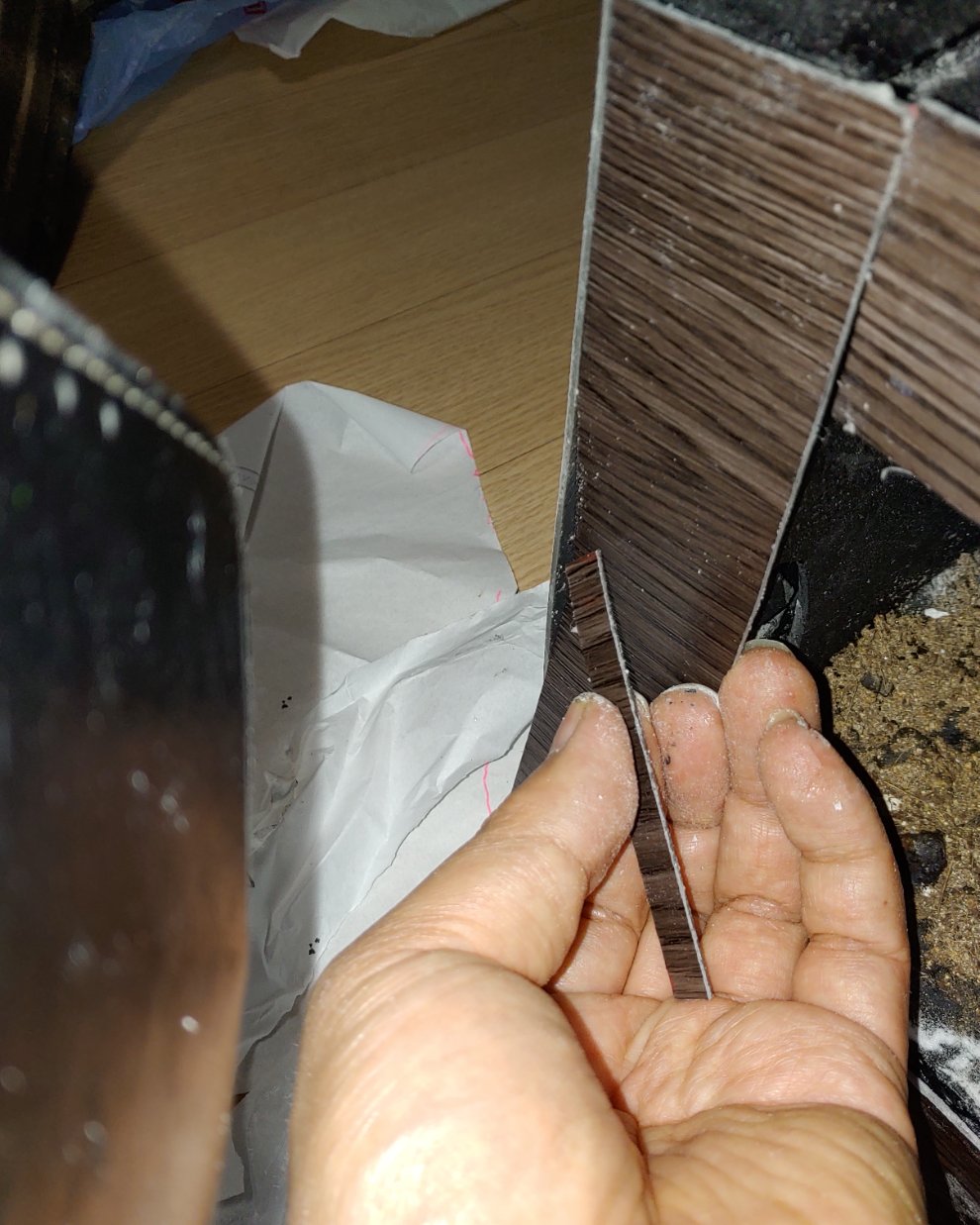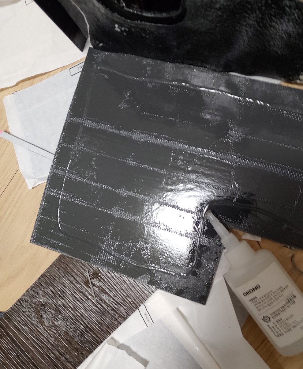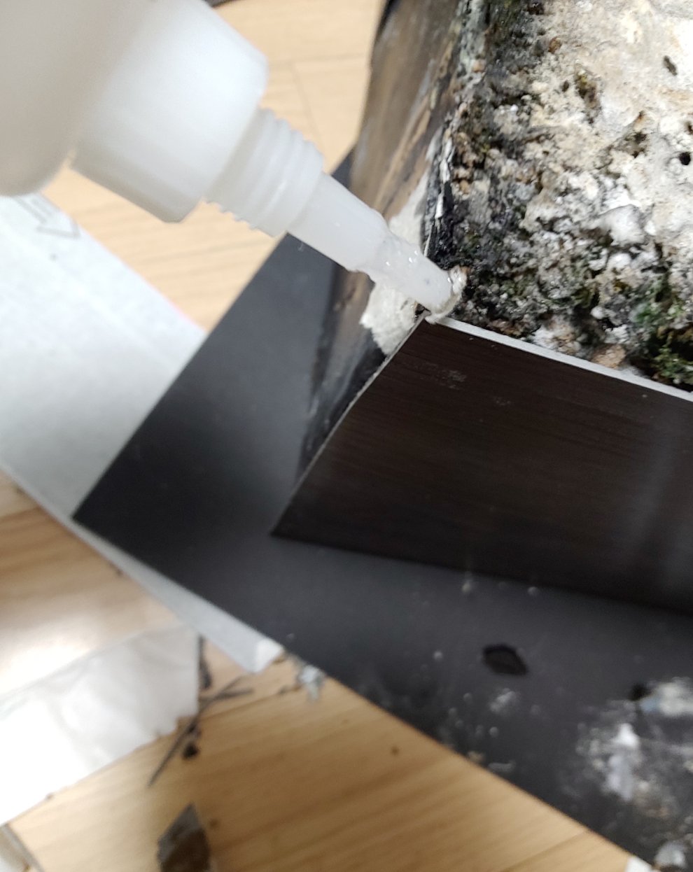 접착제가 끈적이고 잘 붙지않아 강력 접착제로 붙입니다.이때 붙일면적에 허공이 있다면 최대한 안쪽으로 붙여야 밑으로 흘러 내리지 않습니다.흘러 내릴시 강력접착제 제거방법은 강력접착제가 마르기전 식소다 또는 베이킹소다를 재빨리 붇혀서 제거하면 강력접착제가 쉽게 떼어 집니다.식소다는 강력 접착제를 빨리 경화시키지만 약하게 붙어 부스러기가 떨어질 정도 입니다.즉 빨리 경화시키는 만큼 단단히 붙지않습니다.