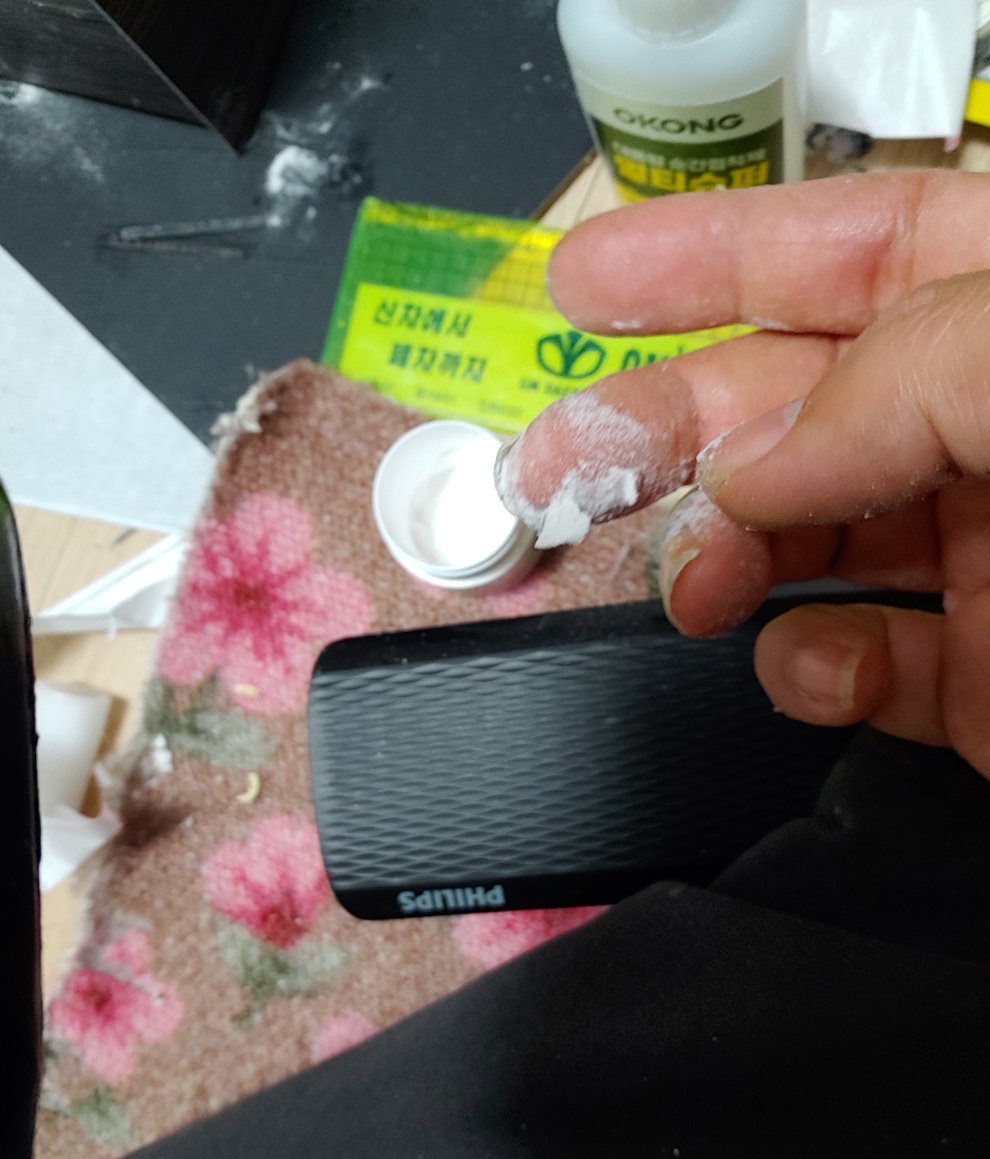 잘안붙은 부분은 강력접착제를 구멍속에 떨어 뜨립니다.너무많이 떨어뜨리면 안되요 바닥에 묻었을땐 아까말한것처럼 식소다 뿌려 줍니다.