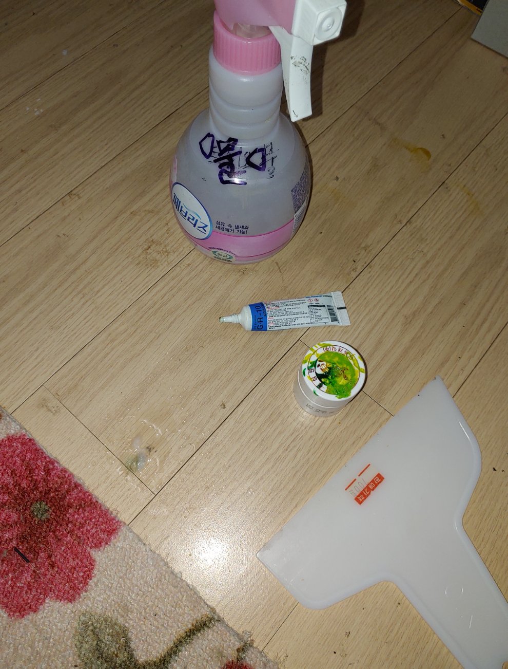바닥에 묻었을때는 강력접착제 제거제 +식소다 +소량의물을 뿌려주고 섞어준뒤 1시간쯤지나 프라스틱끌로 벳겨내면 더잘벗겨집니다.
