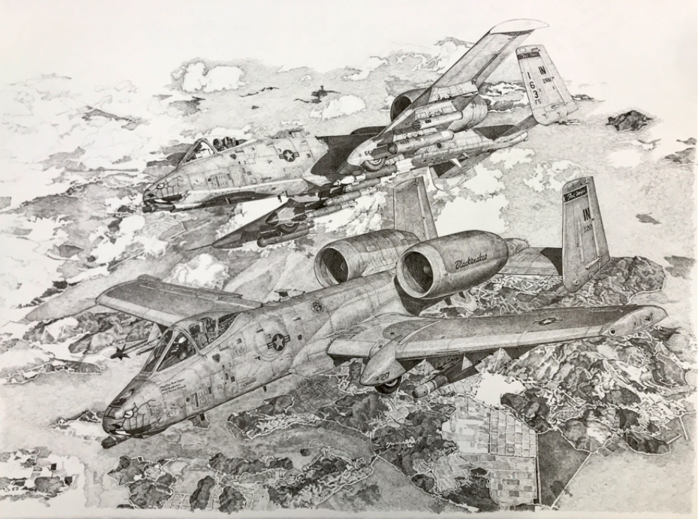 열심히 그리고 있는 a-10 펜화입니다.