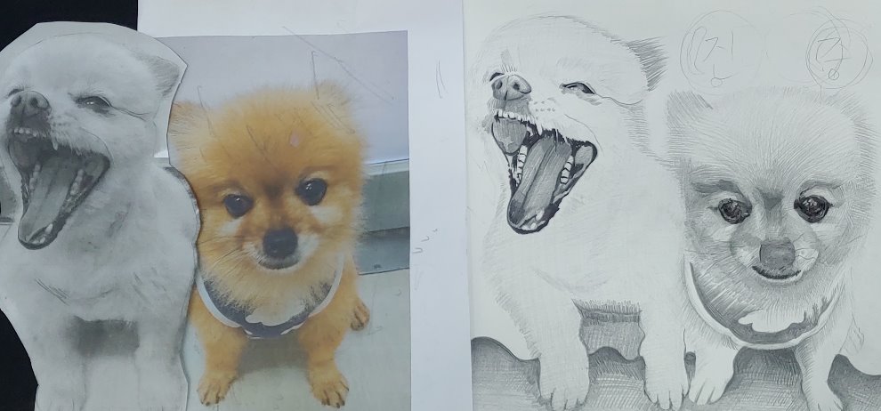 1:1로 프린트합니다.스케치는 정확해야 되는데 스케치 하기가 까다로워 편법으로 1:1프린트 한뒤 뒷면에 연필을 칠해 먹지를 만든뒤 사진을 도화지에대고 사진의 외곽을 그어주면 쉽게 스케치를 할수있습니다.