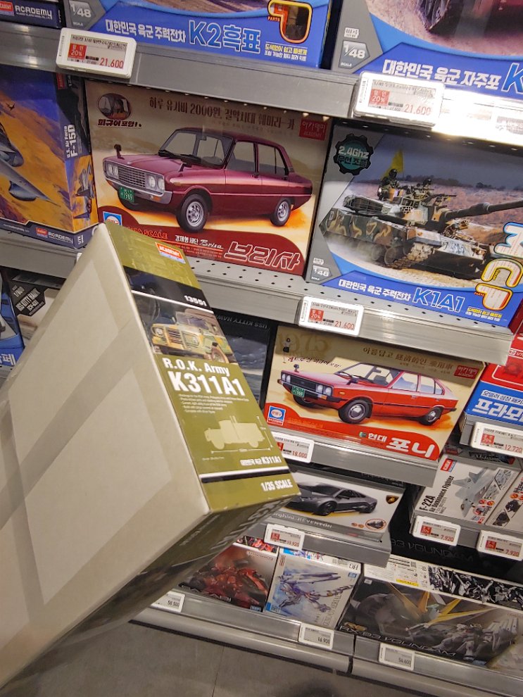 요새 아카데미 20% 추가 할인을 해서 좀 살펴봤더니 박스 아랫쪽을 빙 둘러서 테이프로 밀봉을 해놨네요. 부품 절도가 있었는진 모르겠지만 박스도 잘 보관하는 입장에선 참 짜증나는 짓거리네요. 고객센터에 항의 한번 넣고 안바뀌면 이마트 프라모델은 안녕이네요.