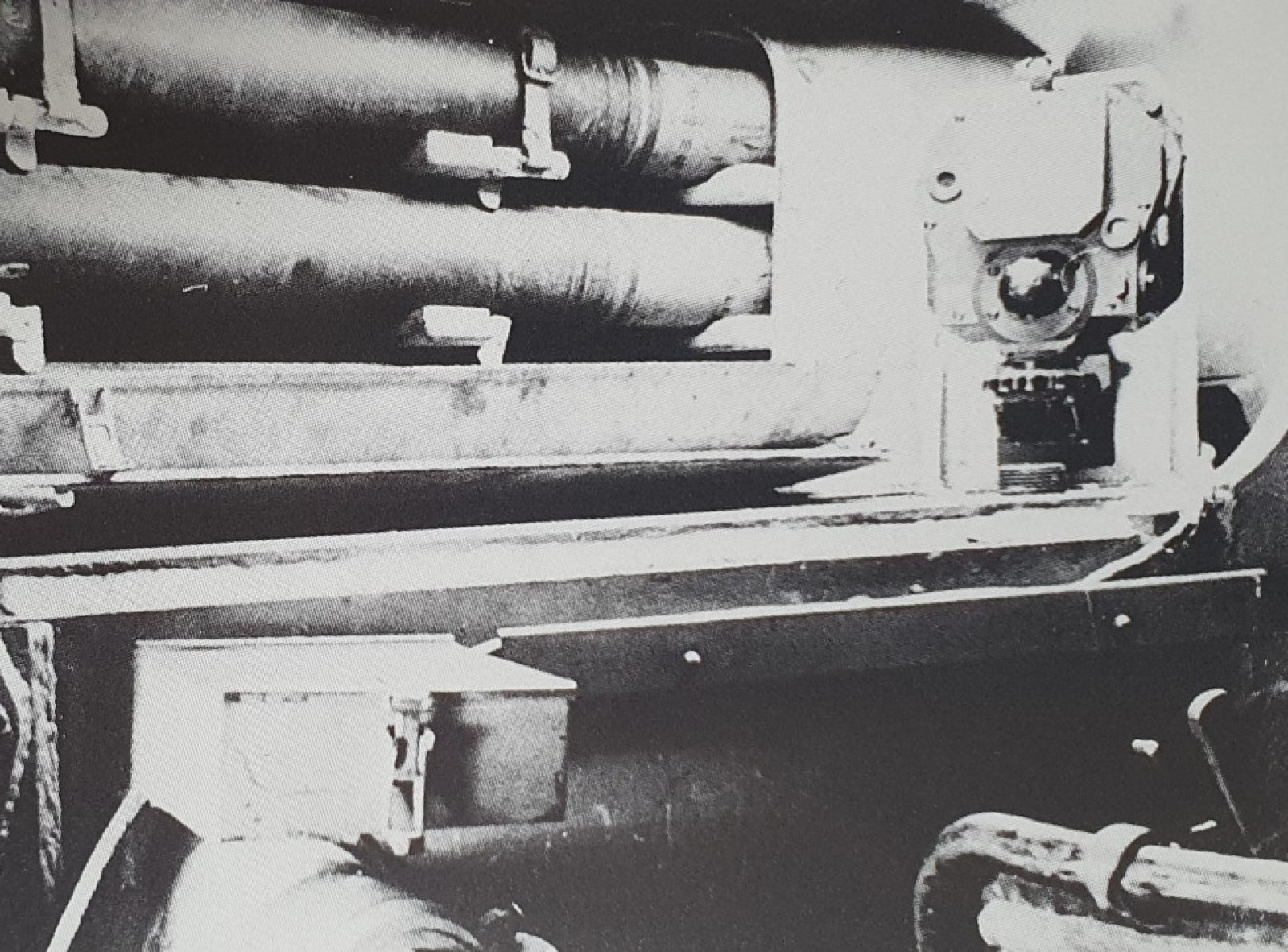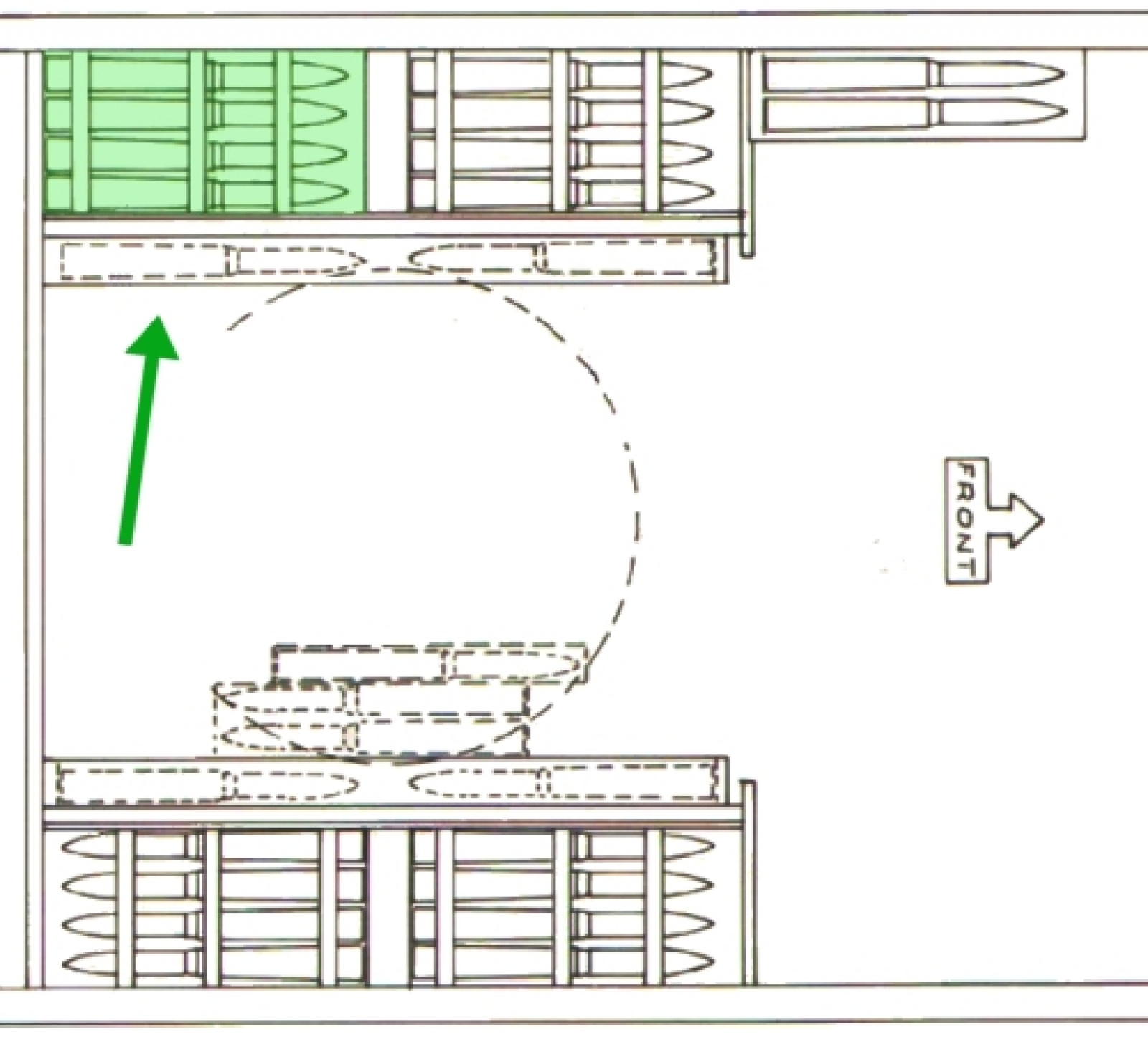 ** 아래 사진을 보면, 티거 I 중기형 이후의 차체 내부 모습입니다. 88mm 포의 카운터 밸런스가 포탑 뒤쪽에 있는 것이 특징 중 하나죠. 사진 뒤쪽에 보이는 88mm 수납랙이 바로 문제의 수납랙입니다. 역시 지지대 간격이 좁은쪽이 전방에 있습니다. 그러면 포탄의 탄두가 전방에 위치하겠죠.