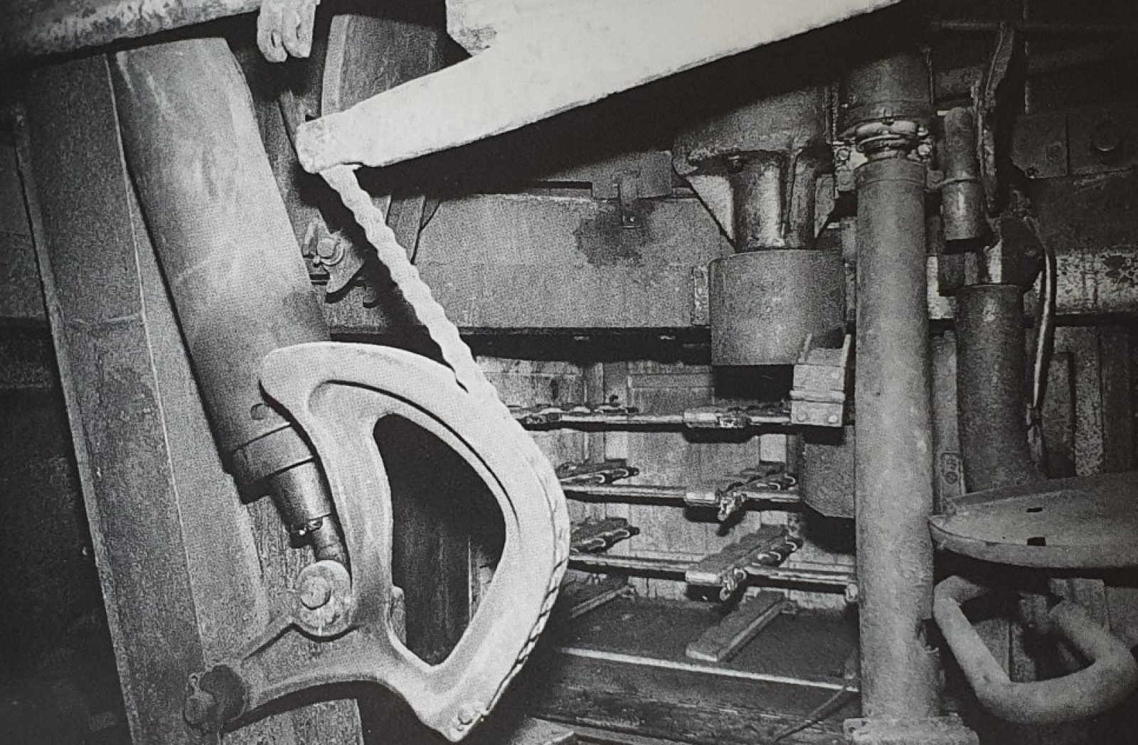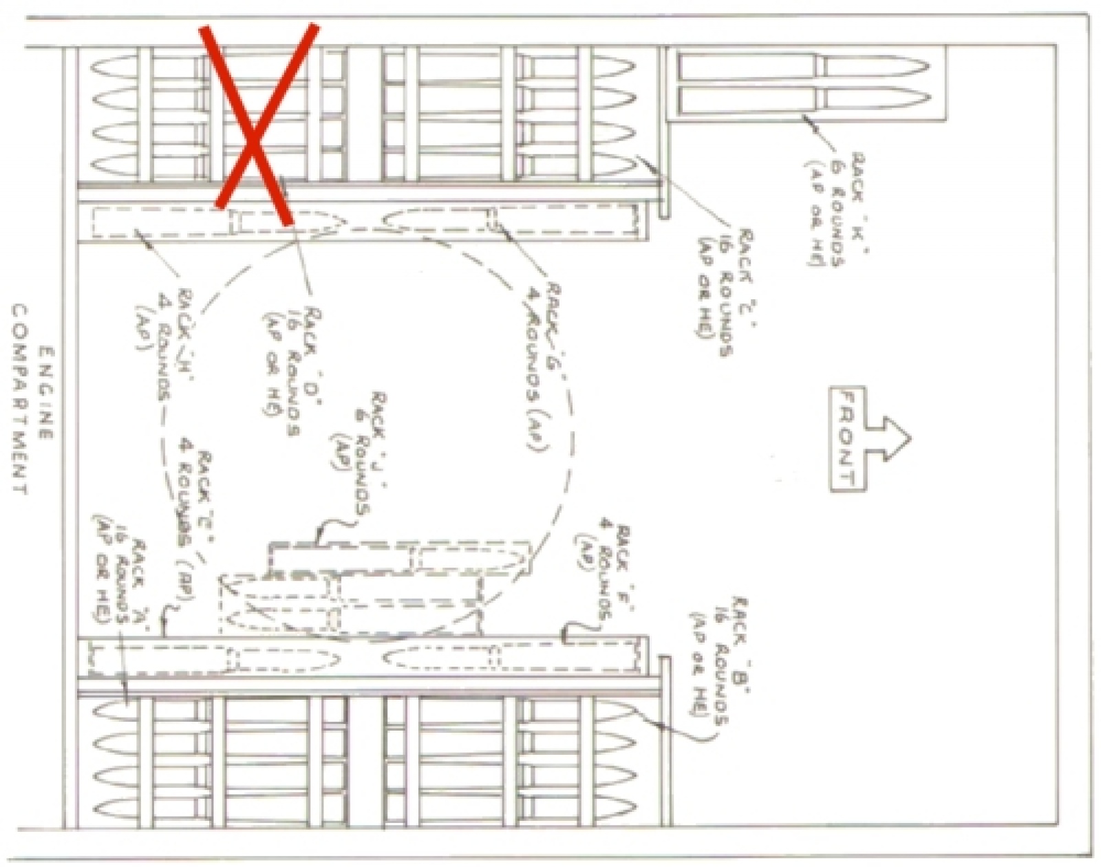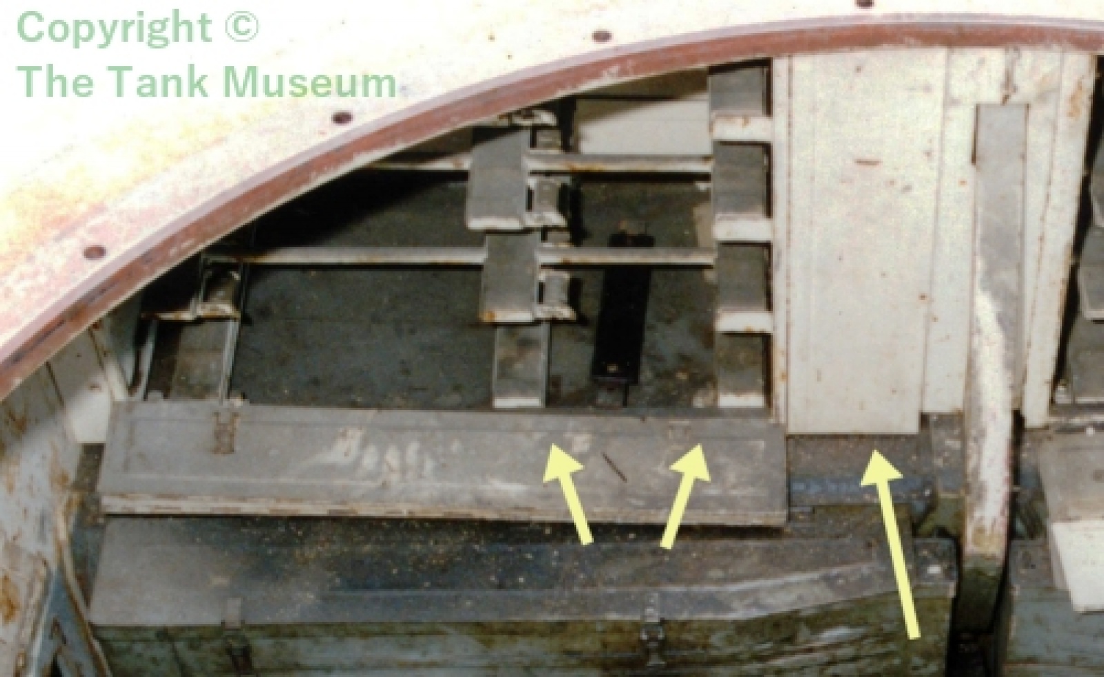 아래 사진은 차체 왼쪽 스폰슨에 위치한 88mm 포탄 수납랙인데요, 왼쪽 방화벽이 보이는 것으로 보아 왼쪽 후방의 수납랙이 틀림 없고 지지대의 간격이 짧은 쪽이 탄두가 위치합니다.