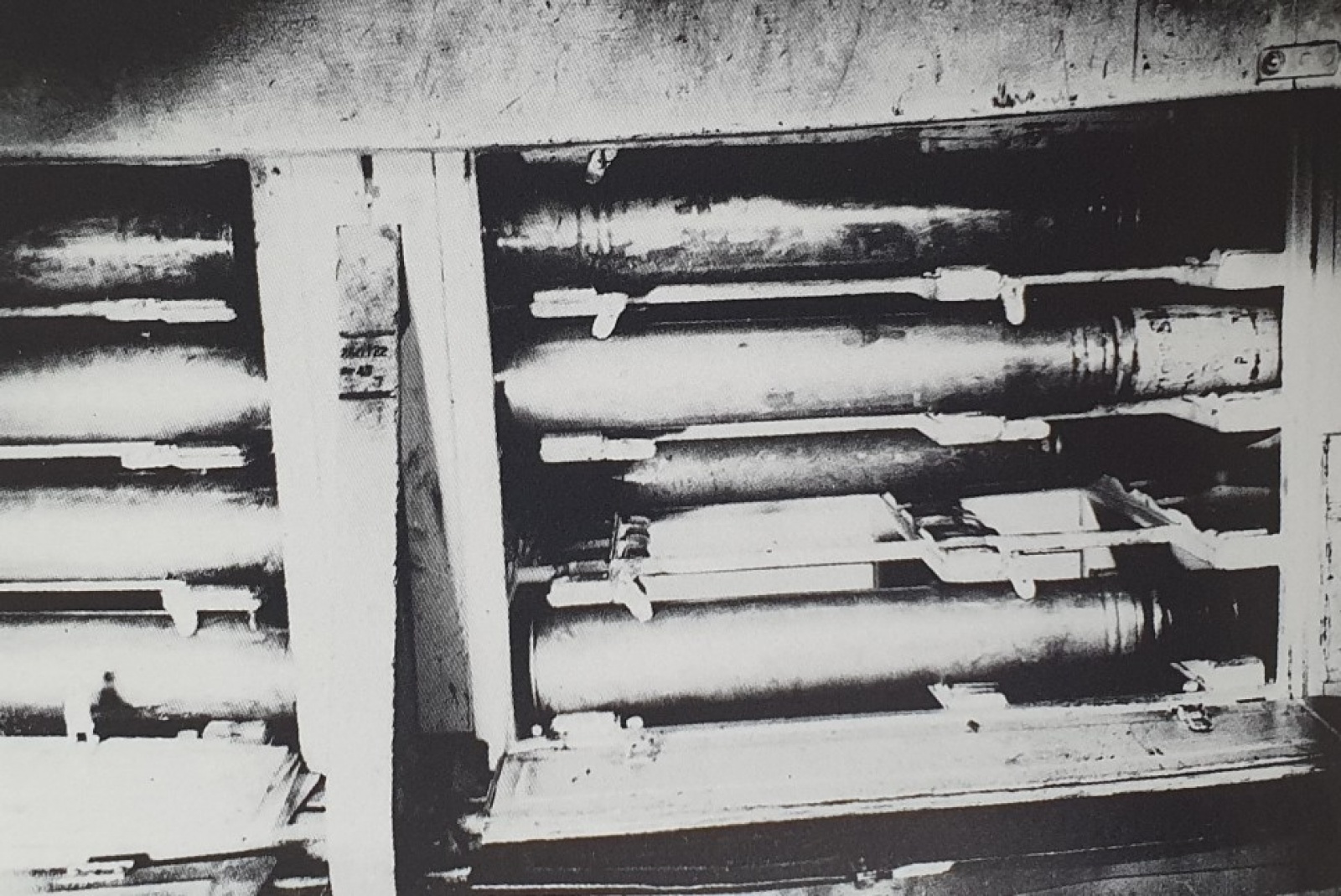 랙을 보면 3개의 지지대가 있고 간격이 짧은 쪽이 포탄의 탄두가 위치합니다.