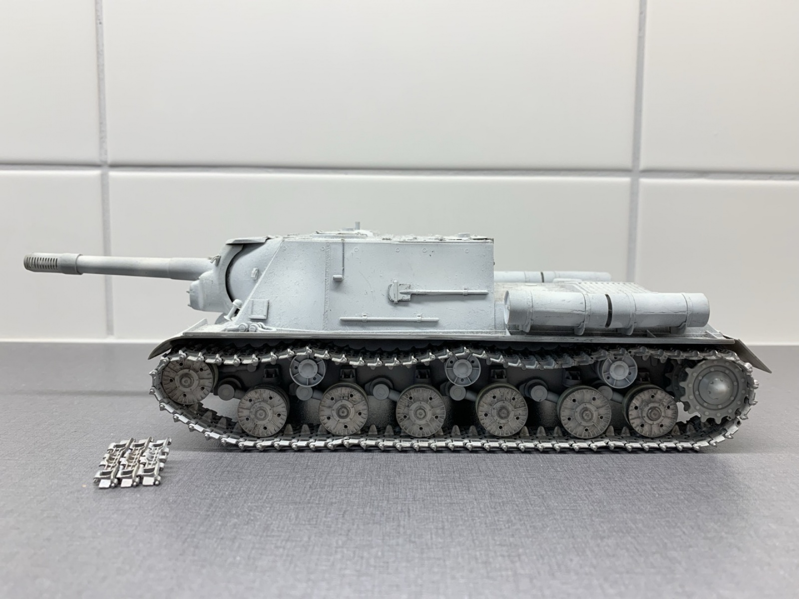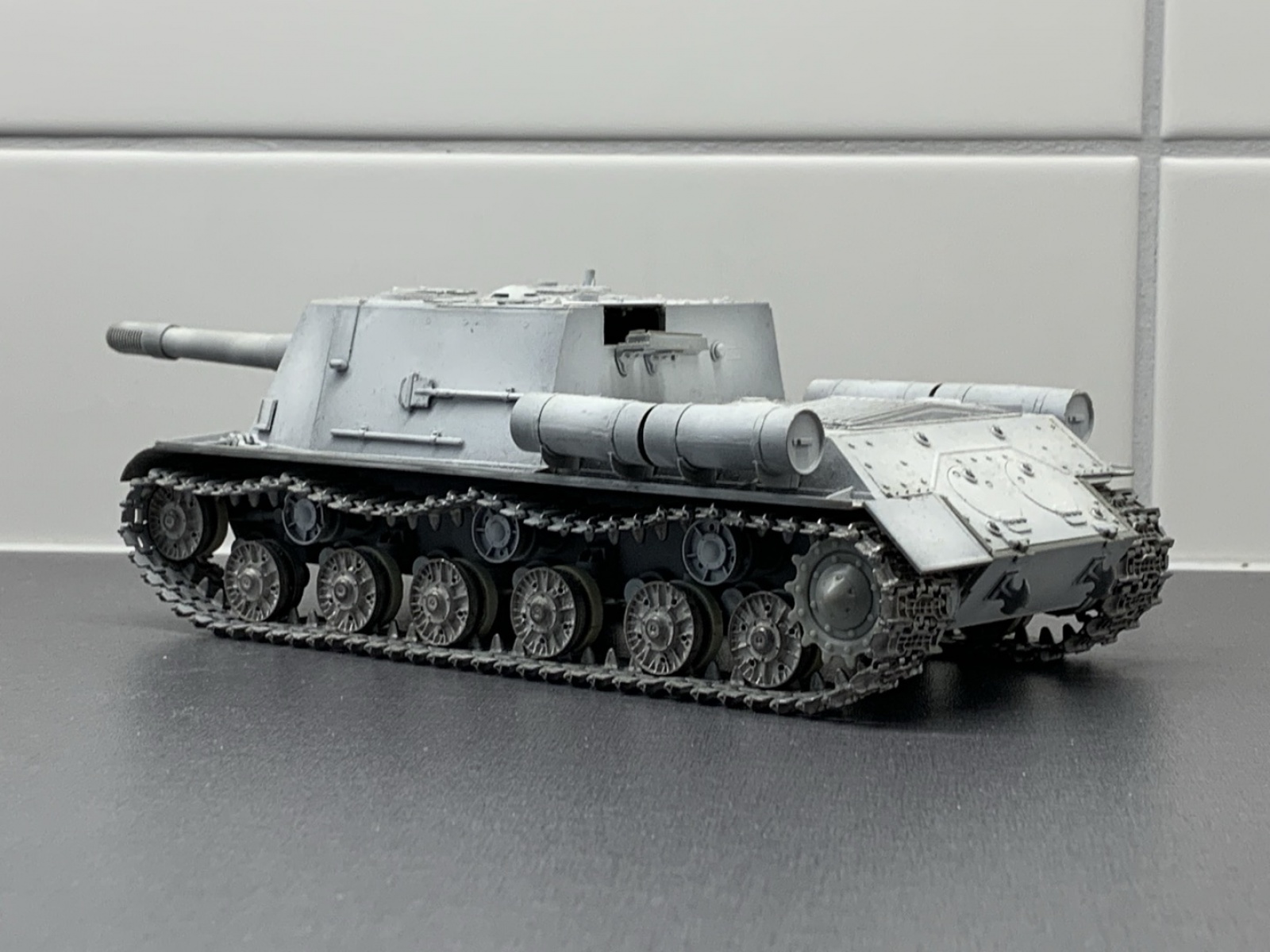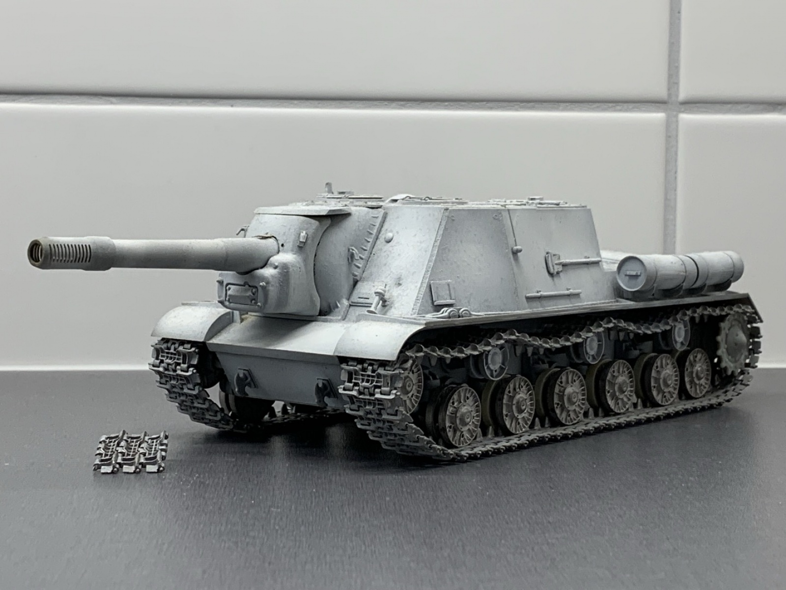 먼저 즈베즈다 1/35 JSU-152 키트입니다. 트랙과 바퀴는 프리울 금속제입니다. 요즘 3D 트랙이나 레진 트랙이 나오고 꽤 정밀해졌지만 날카로운 금속 이미지를 재현하는 것은 아무래도 금속제를 못따라 옵니다. JSU 시리즈에 꽂힌 것은 먼저 올린글에 나왔던 영국잡지 밀리터리 인 스케일에 드래곤 JSU-122가 모델카스텐 트랙과 같이 나왔던 기사 덕분이었습니다. 그래서 드래곤 키트를 샀었고 꽤 정밀했지만 그 뒤 바퀴 크기 문제, 차체 상부와 하부 간격 문제 등등이 있다는 것을 알게되었고 다소 투박하지만 스케일 및 비례면에서는 정확하다고 알려진 즈베즈다 JSU-152 키트를 구하게 되었습니다. 여기에 프리울제 트랙과 바퀴를 달아주고 차체에 흰색을 칠해주니 꽤 괜찮아 보입니다. 나중에 타미야에서 같은 키트가 나왔지만 프리울 같은 날카로운 느낌은 안납니다. 먼저 샀던 드래곤 JSU-122 키트는 차체 상부와 하부 사이 높이를 조정해 주었고 역시 프리울제 금속 바퀴를 달아주었습니다.